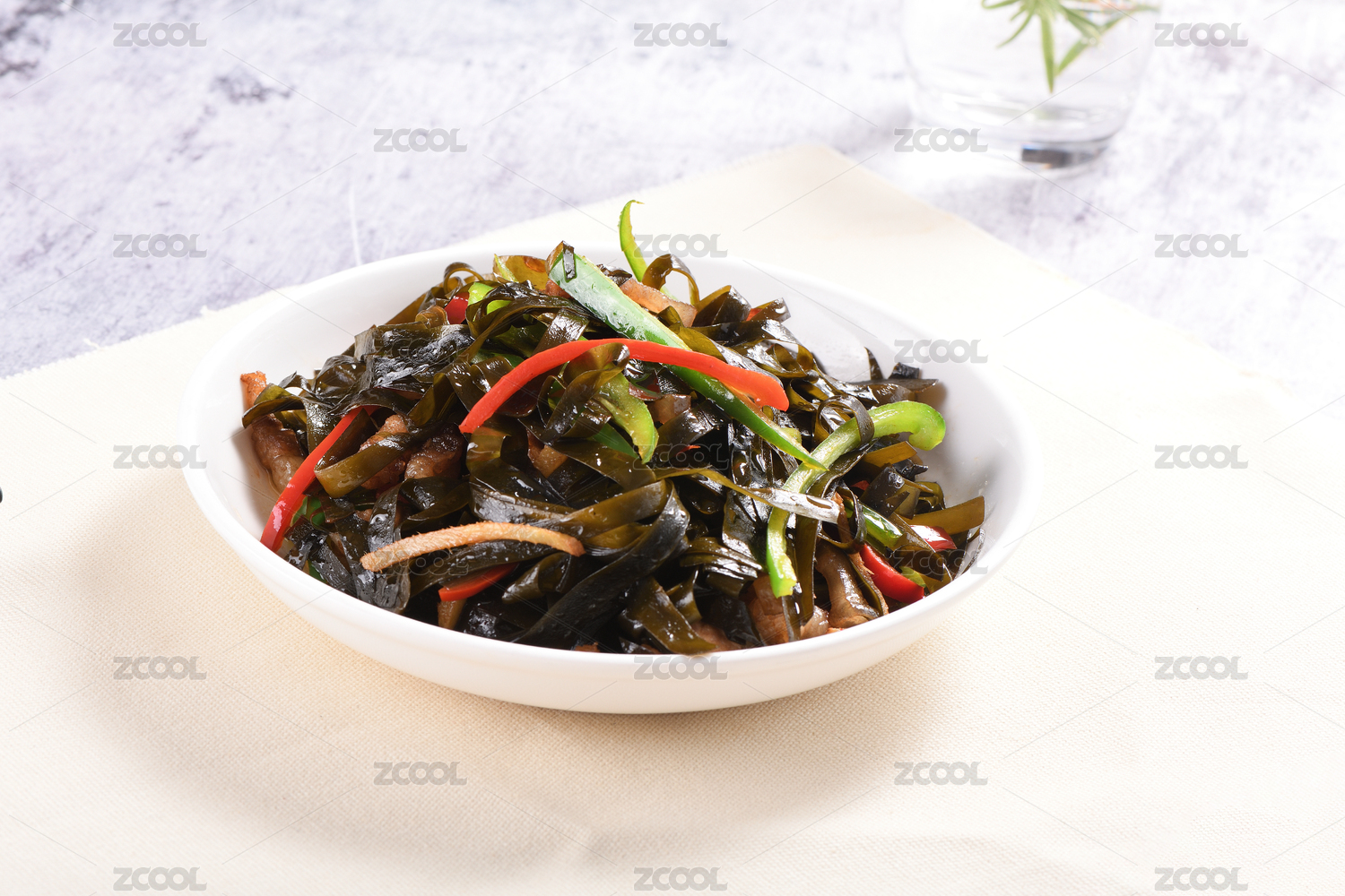 桌子上放着一盘炒海带丝