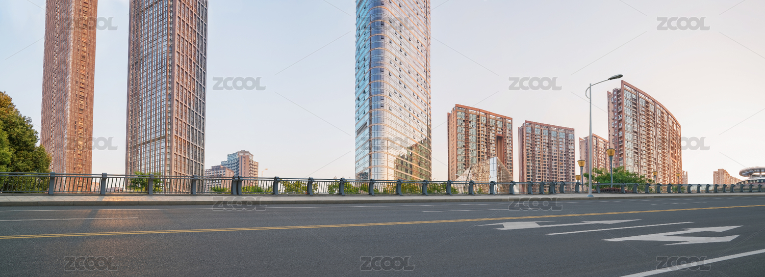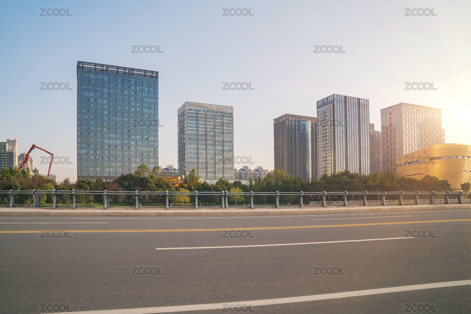 中国杭州空旷的柏油路与现代城市建筑天际线