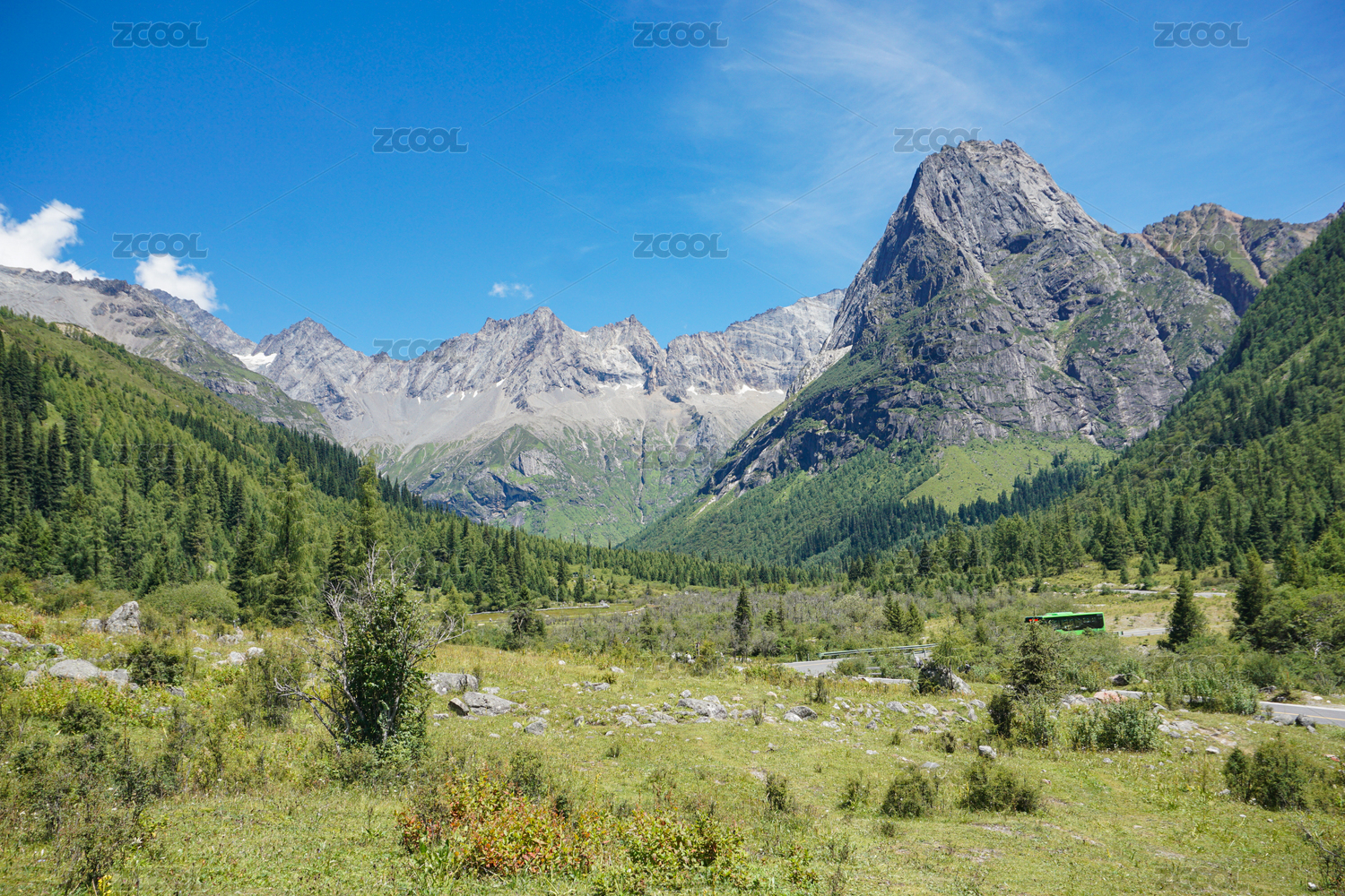 中国川西夏季翠绿的四姑娘山景区雪山及湖泊