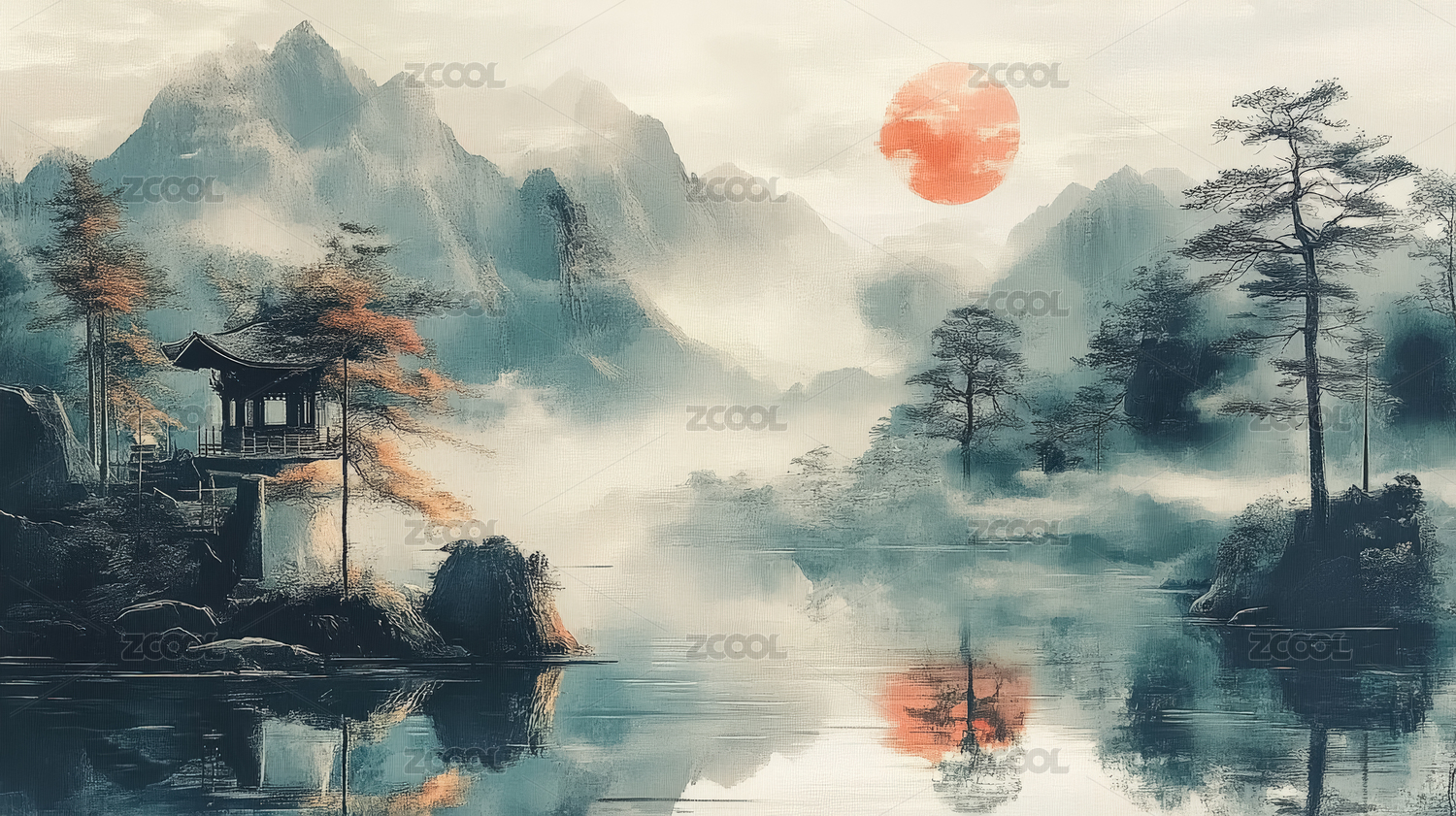 宁静的湖泊与雾气缭绕的山峰和中国传统建筑
