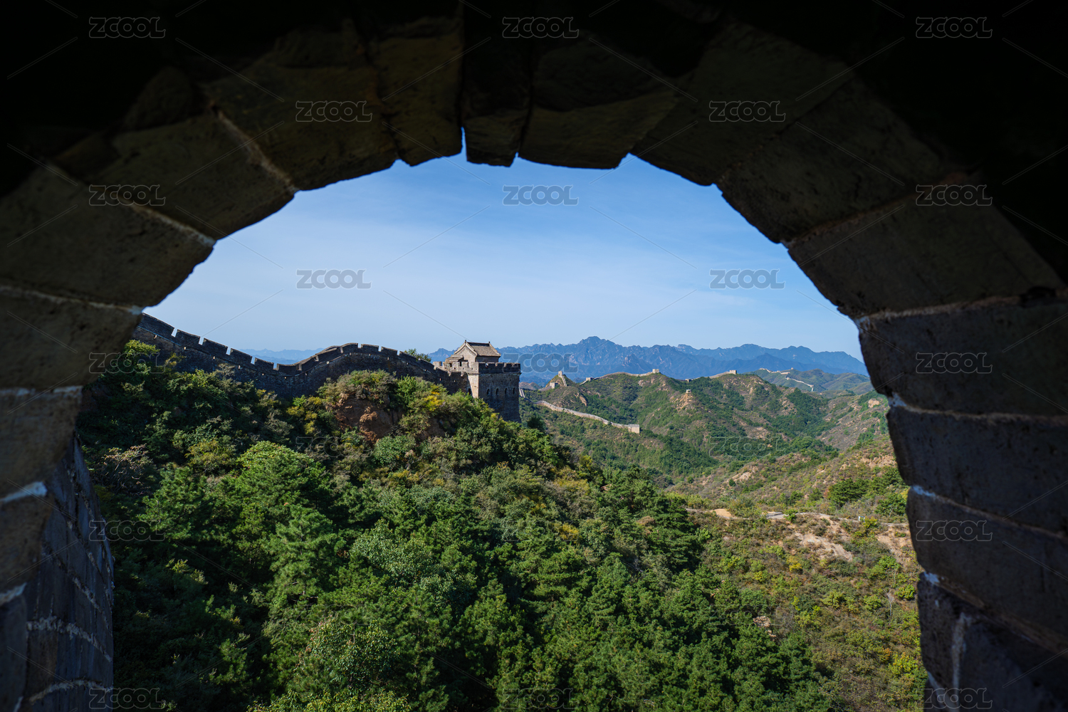 透过长城城楼的窗户看窗外雄伟的长城