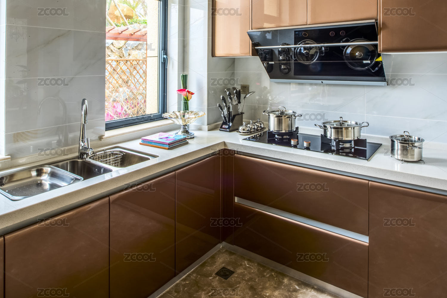 现代风格住宅厨房灶台和抽油烟机 洗菜盆水