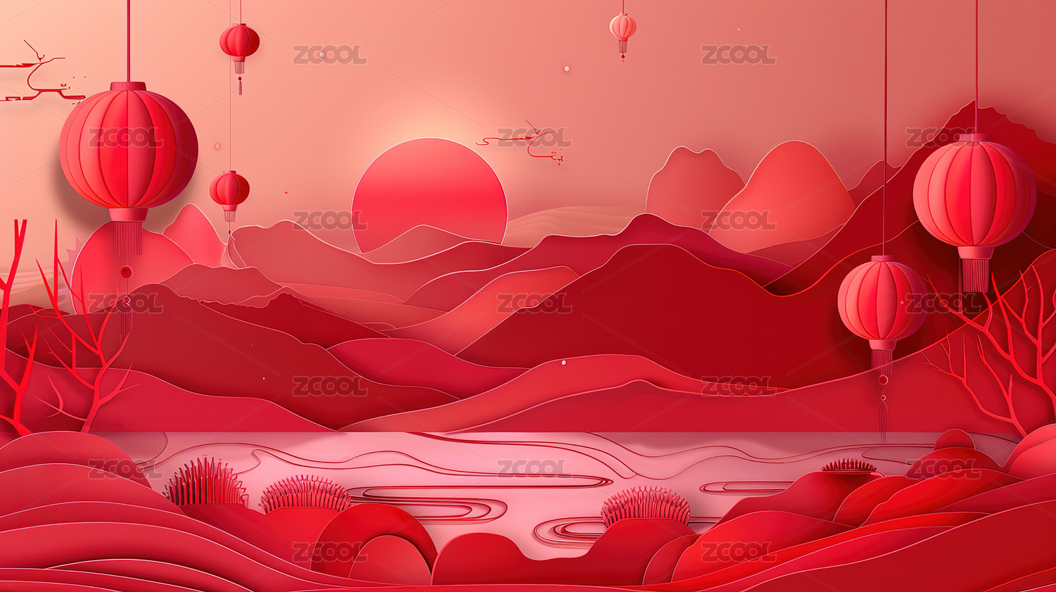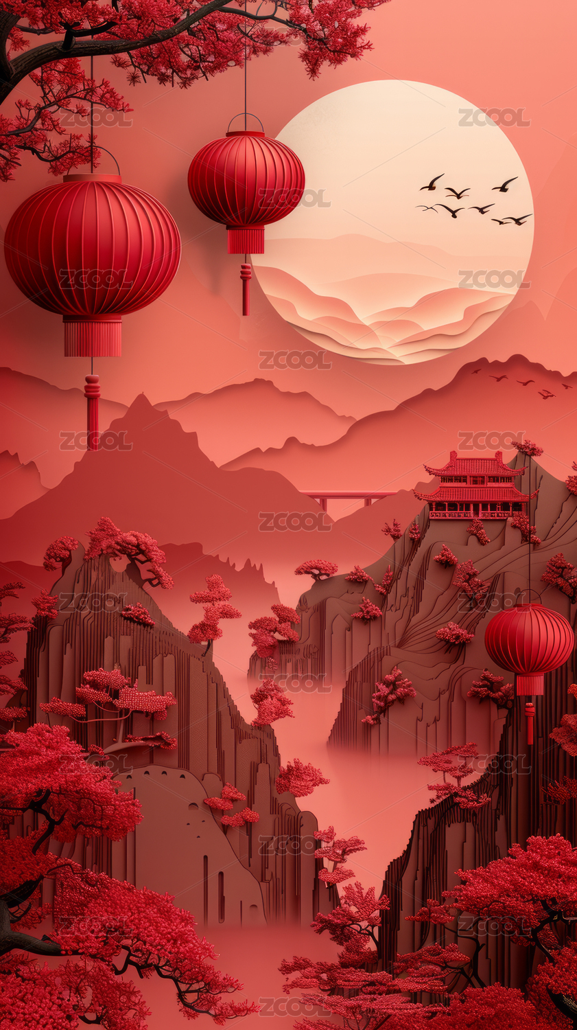红色山峦剪纸风景观