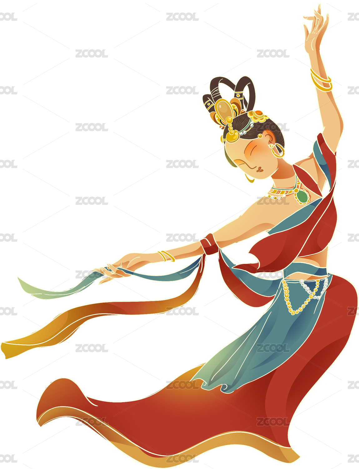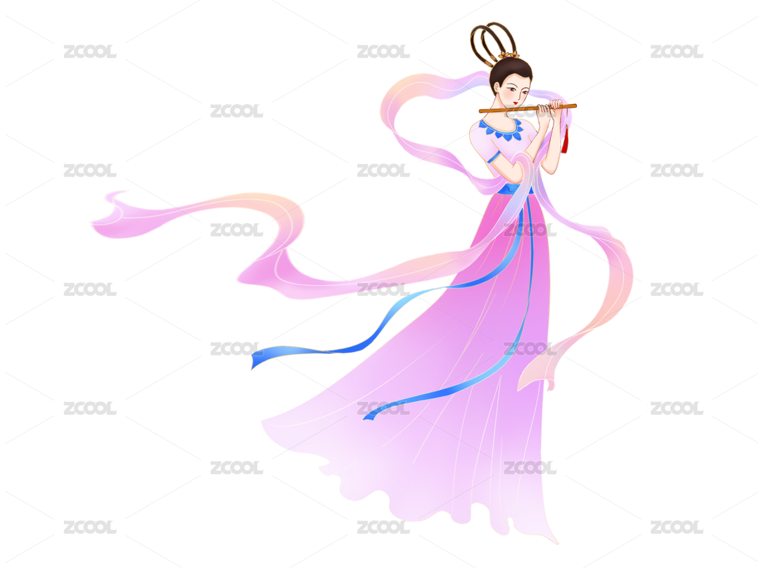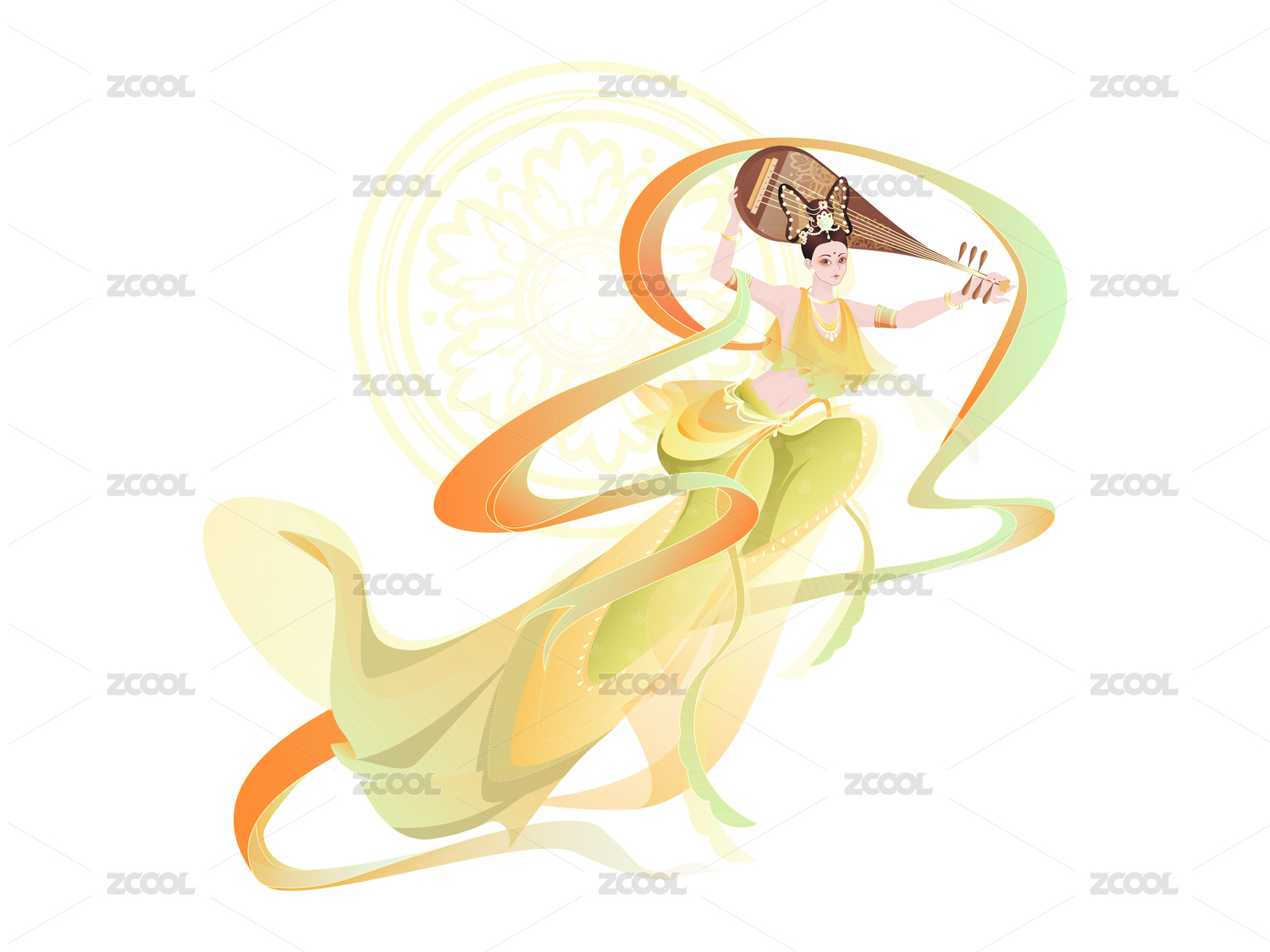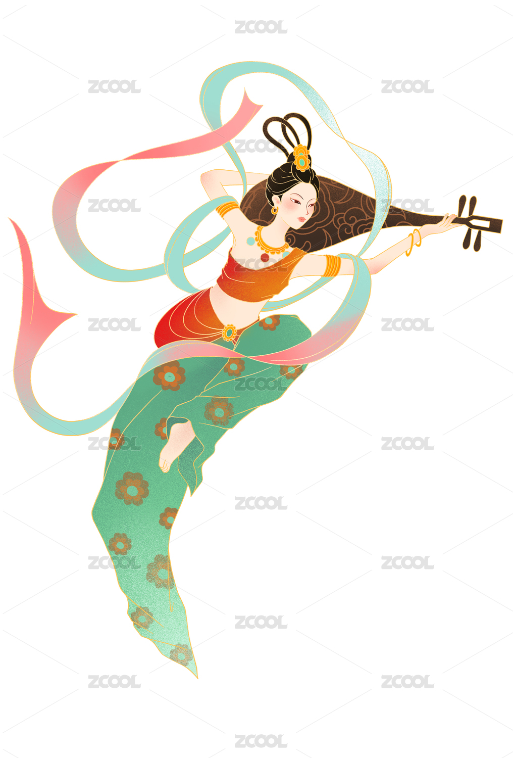敦煌飞天仙女手拿琵琶中国风水墨插画