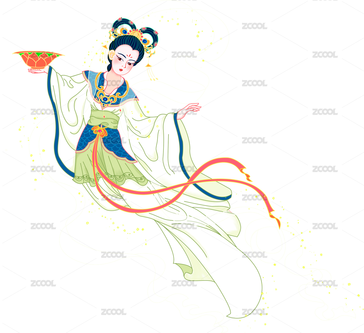 敦煌飞天仙女手拿牡丹中国风水墨插画