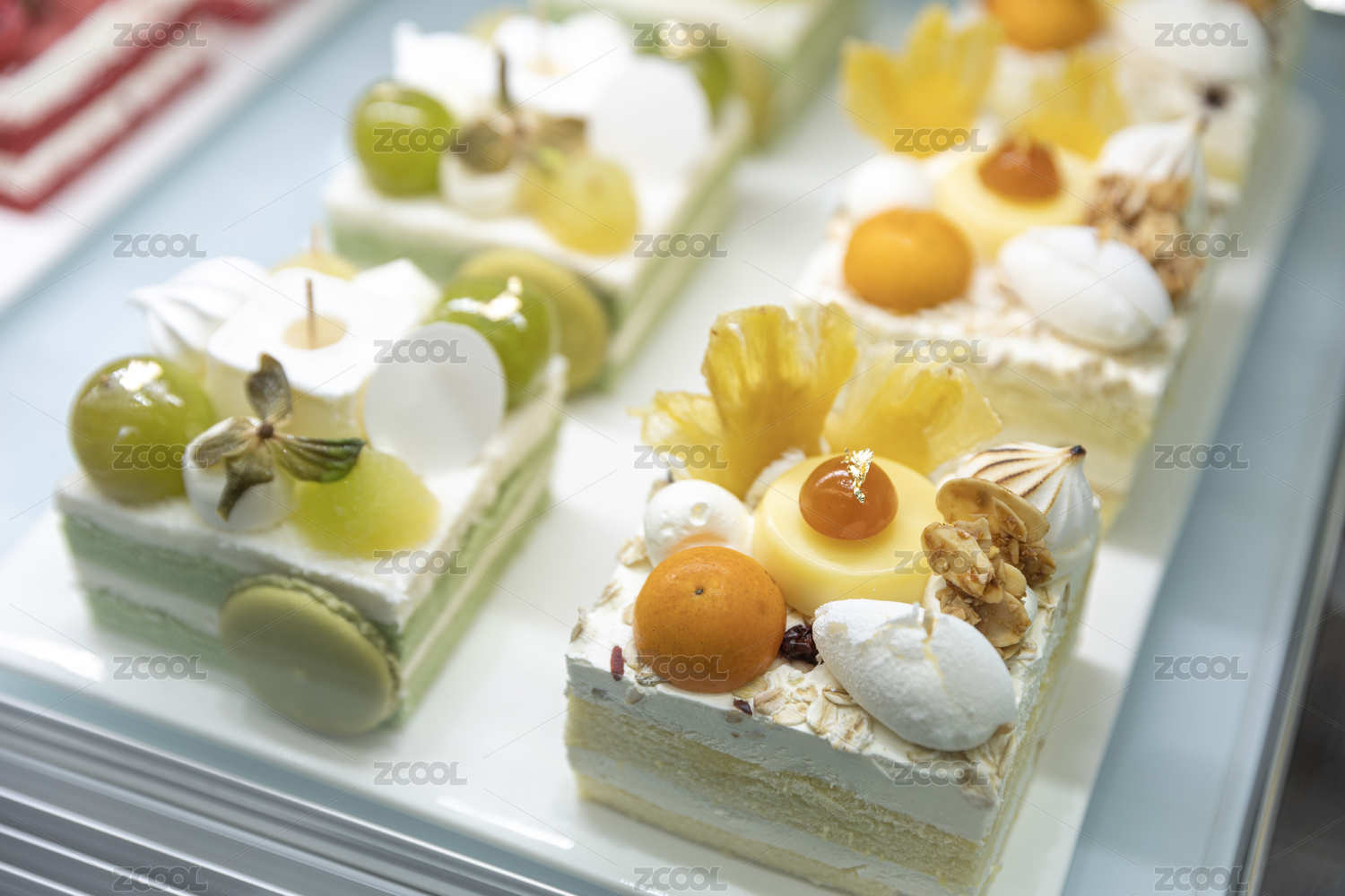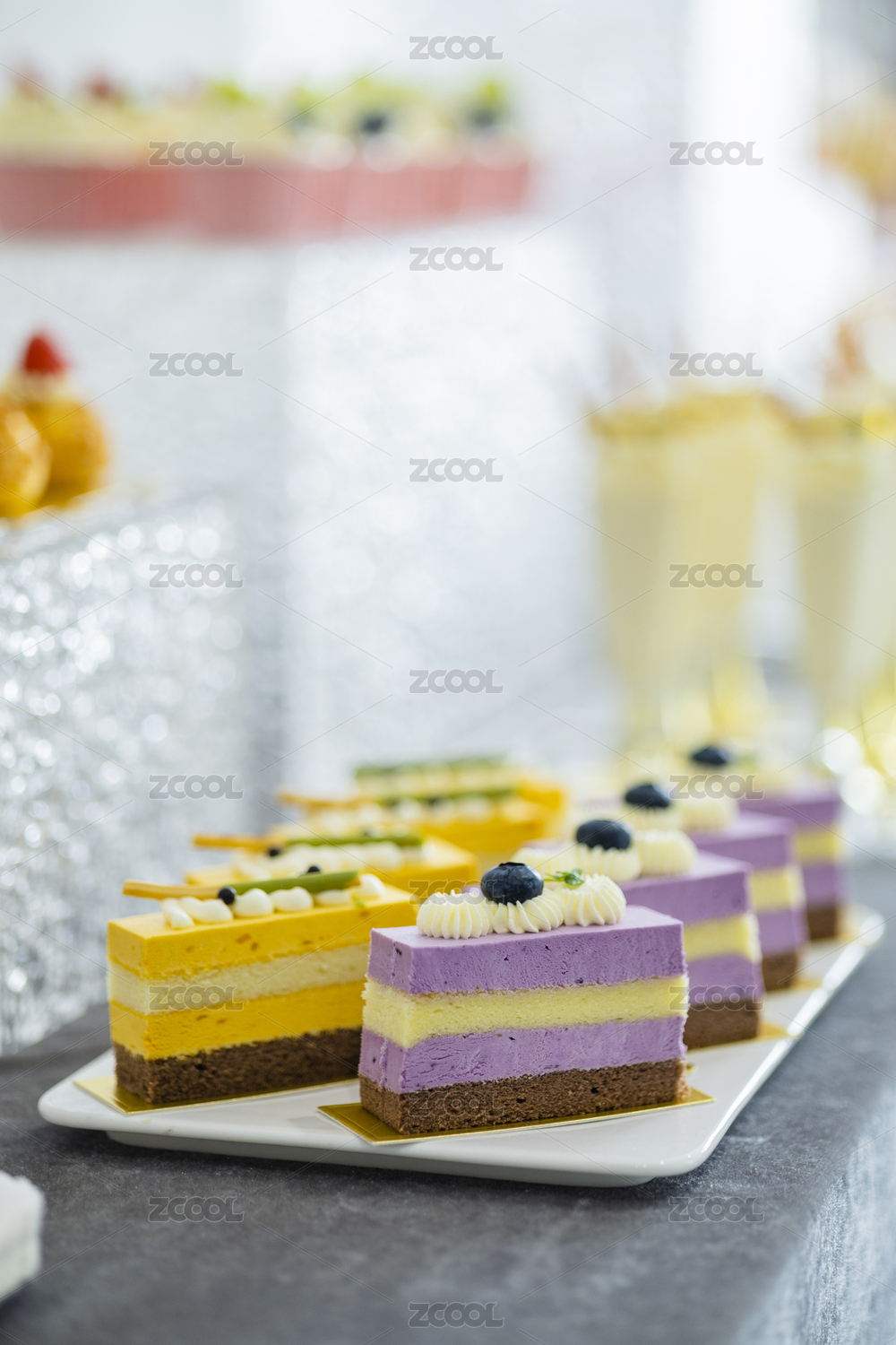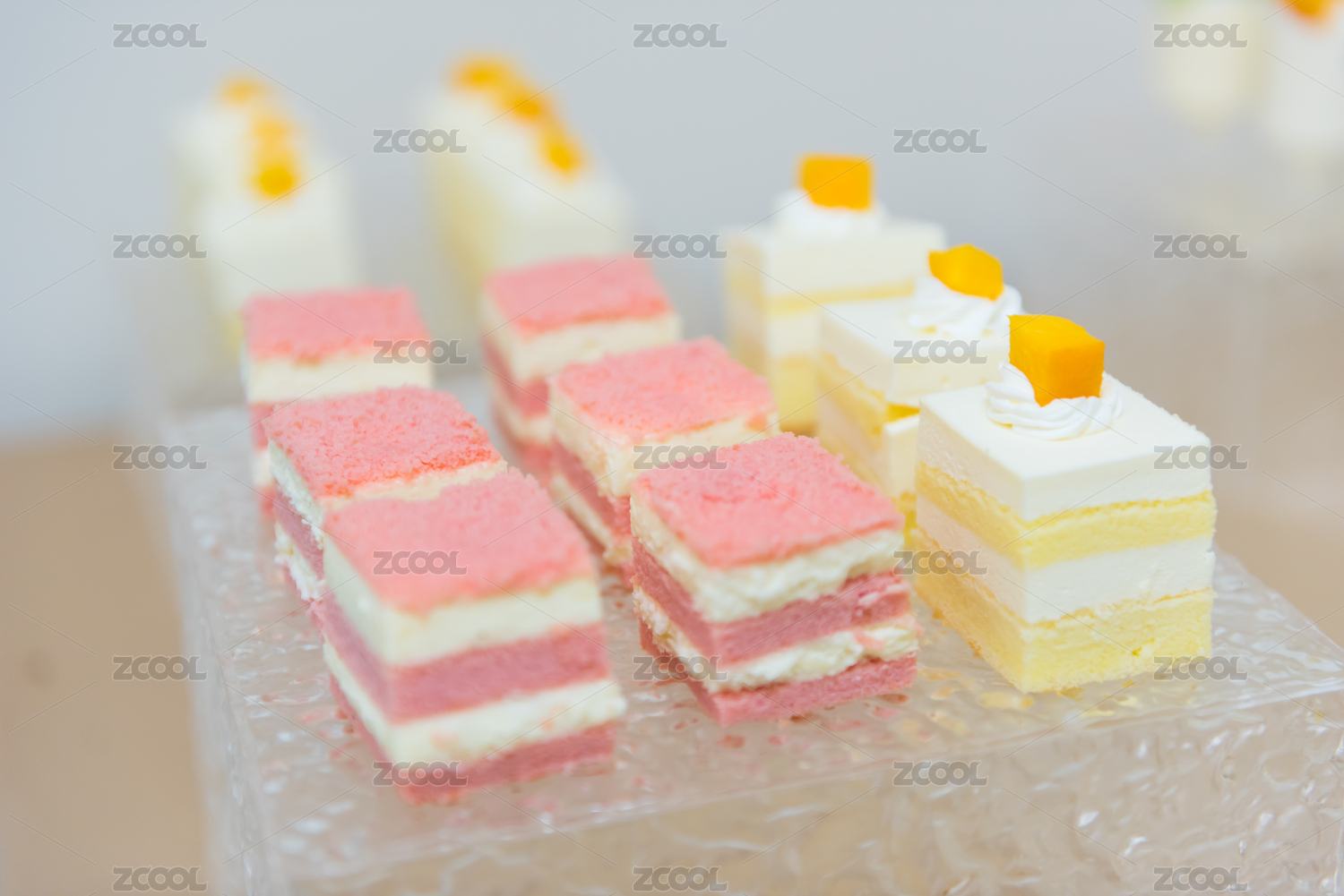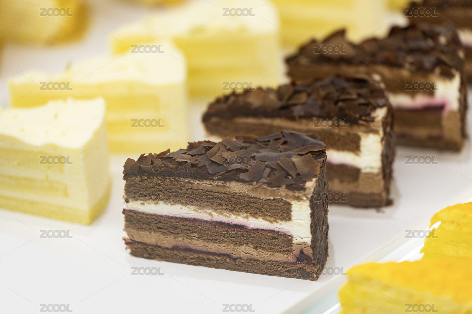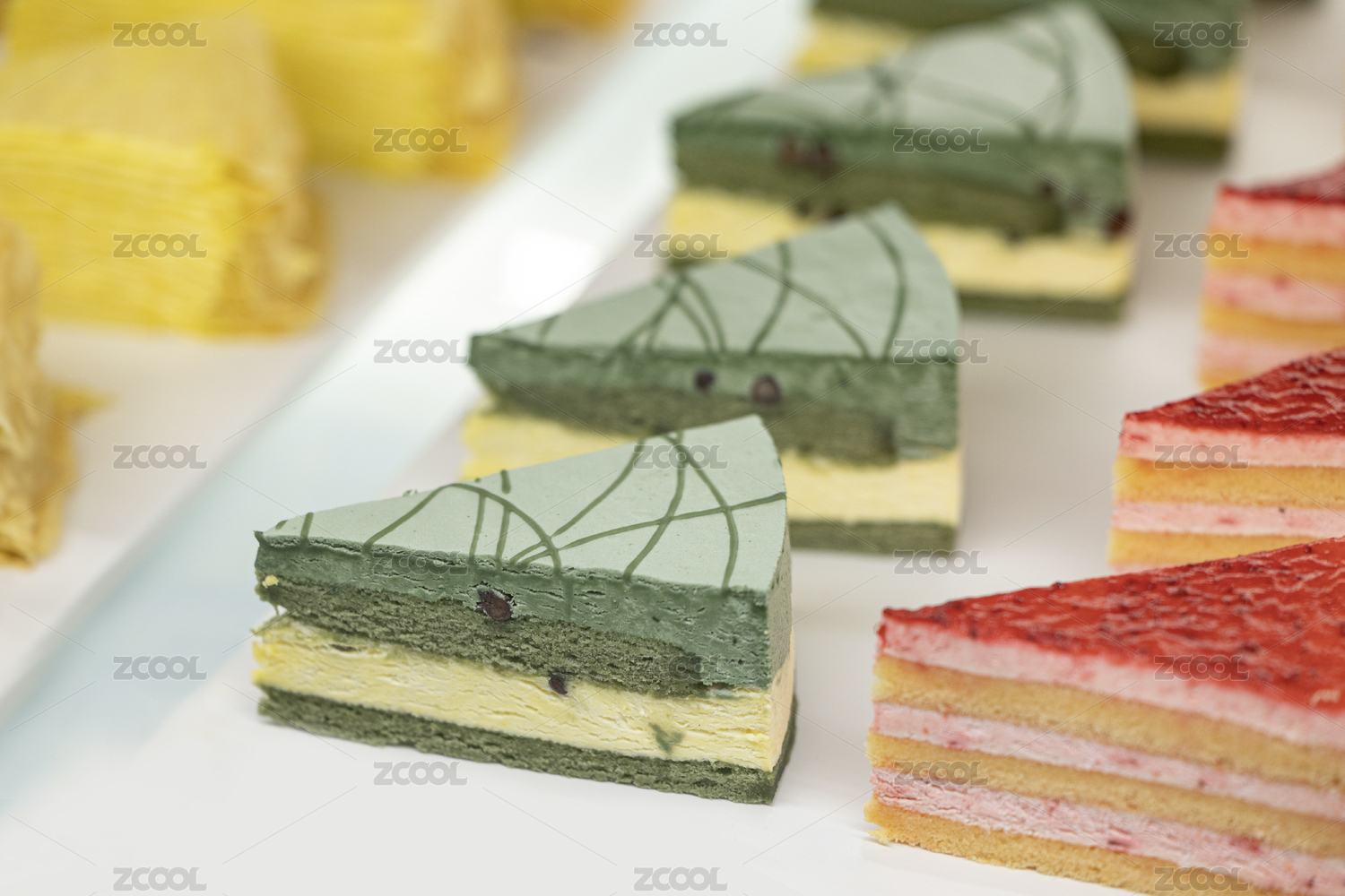 棕色木纹桌面上放着一块切开的彩虹豆多层蛋