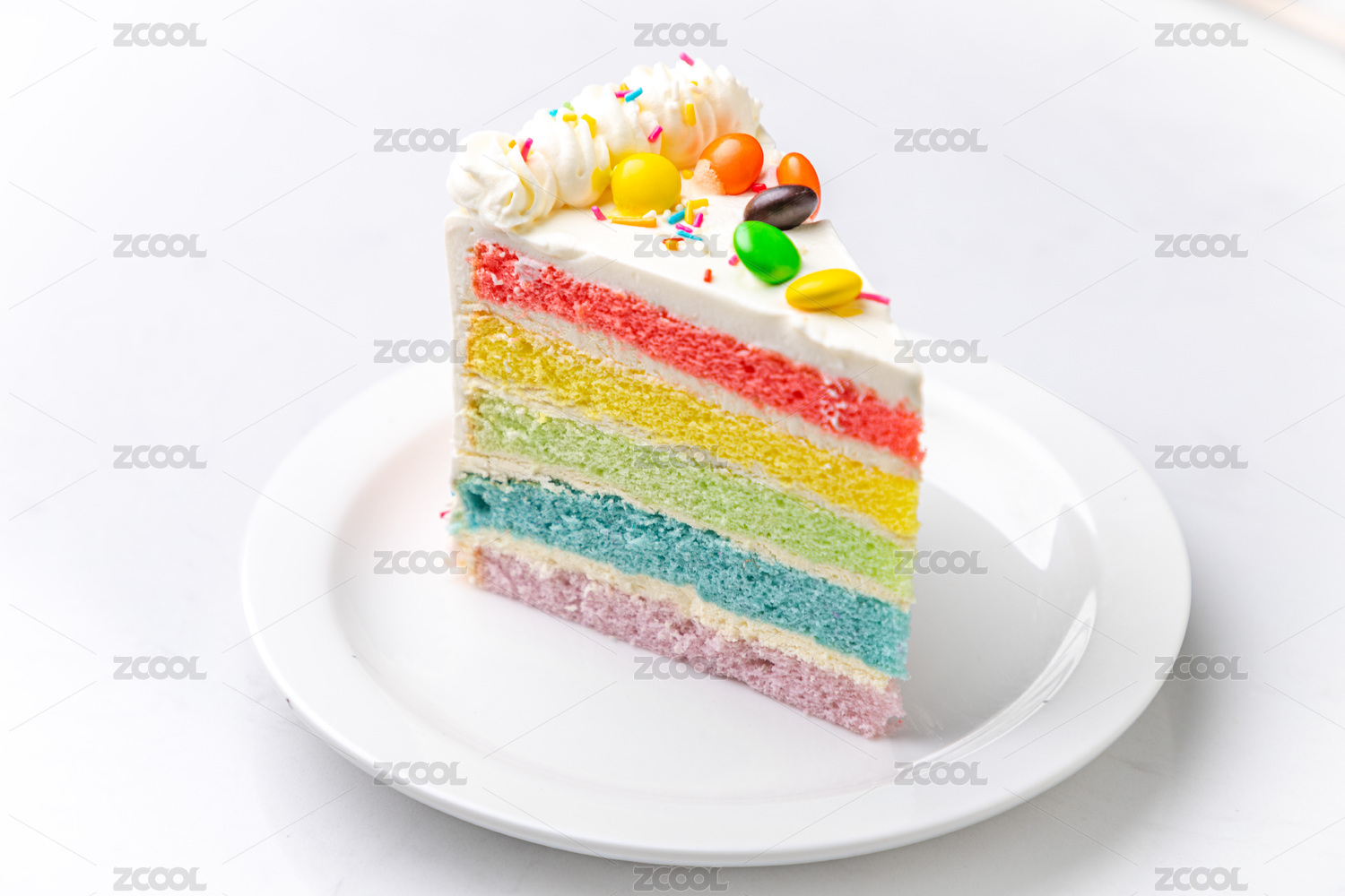 白色桌面上放着一块彩色条纹夹心蛋糕