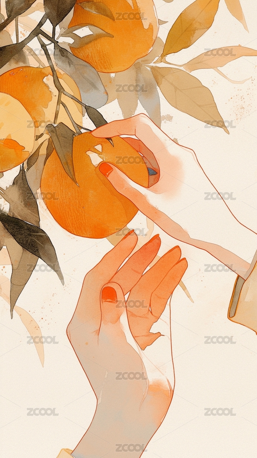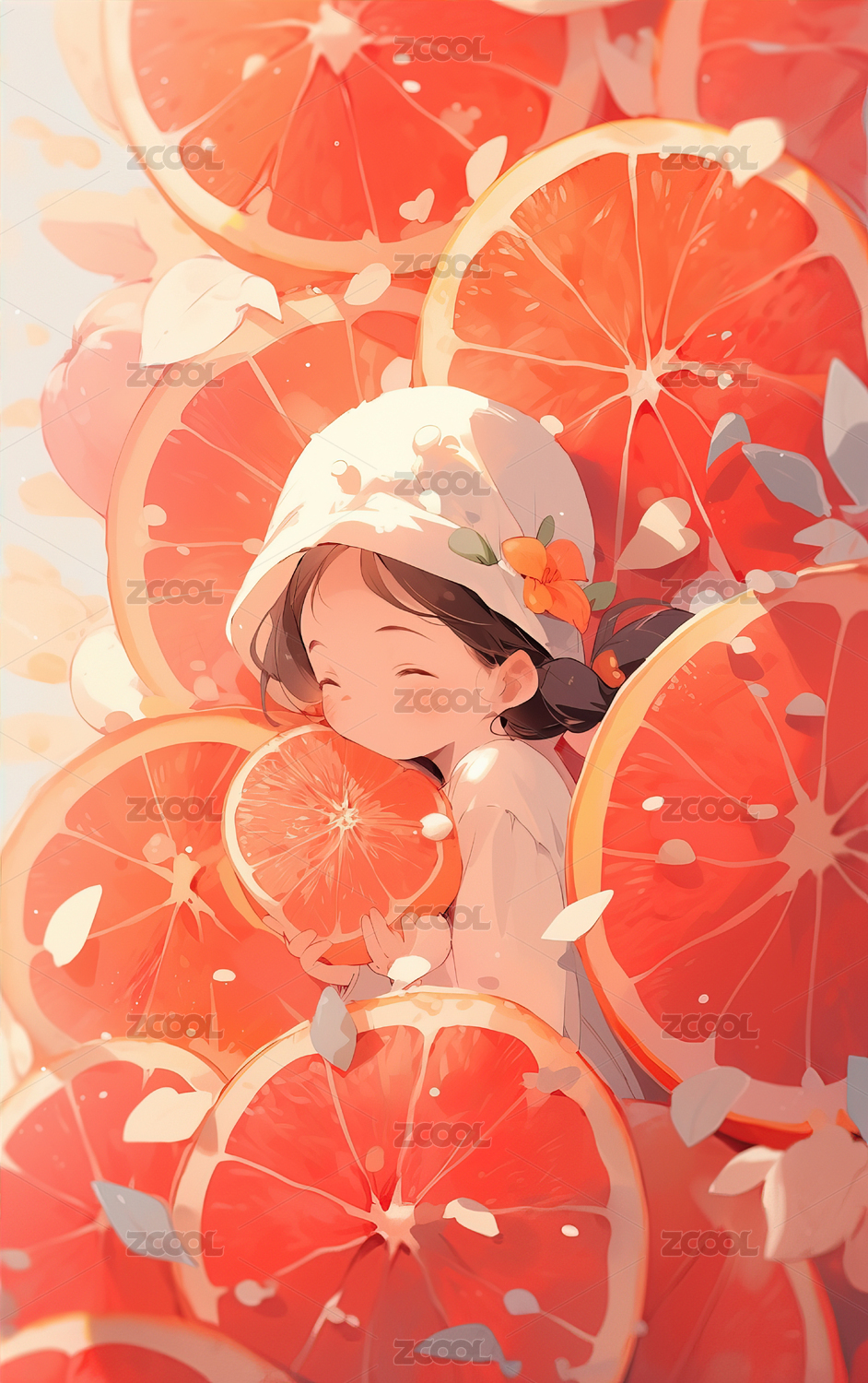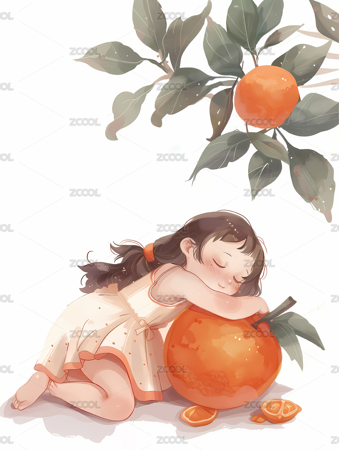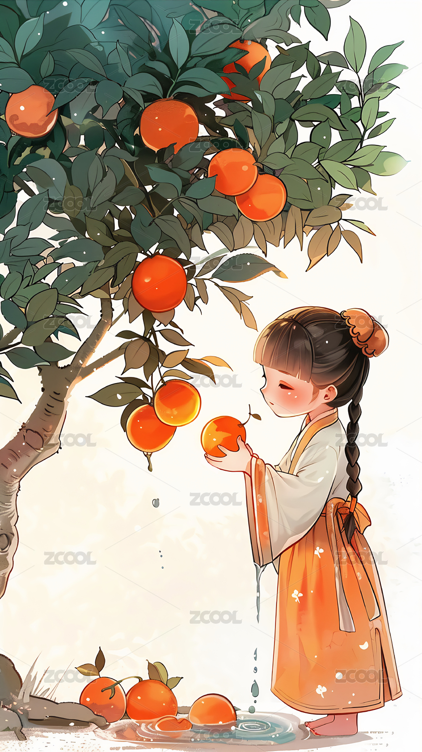 秋天,插画,橙色,立秋,自然,AIGC202402,水果,果实,收获,女孩