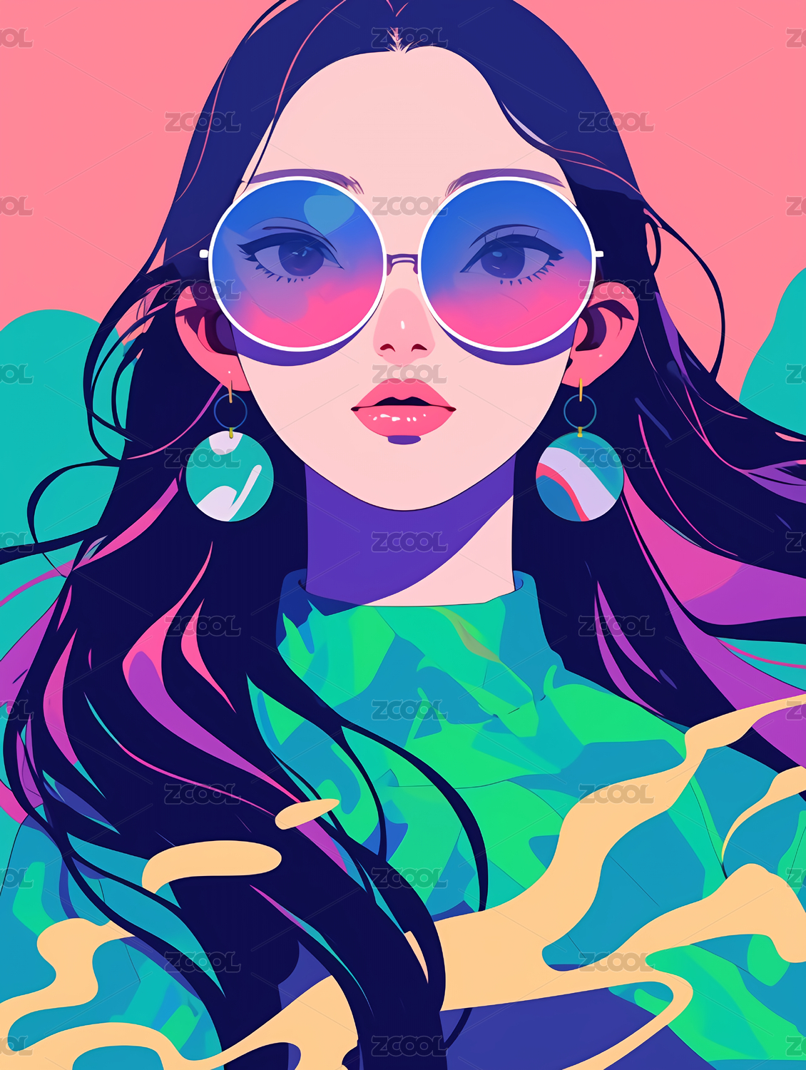 女孩带着棒球帽粉色墨镜,漫画风格美女形象