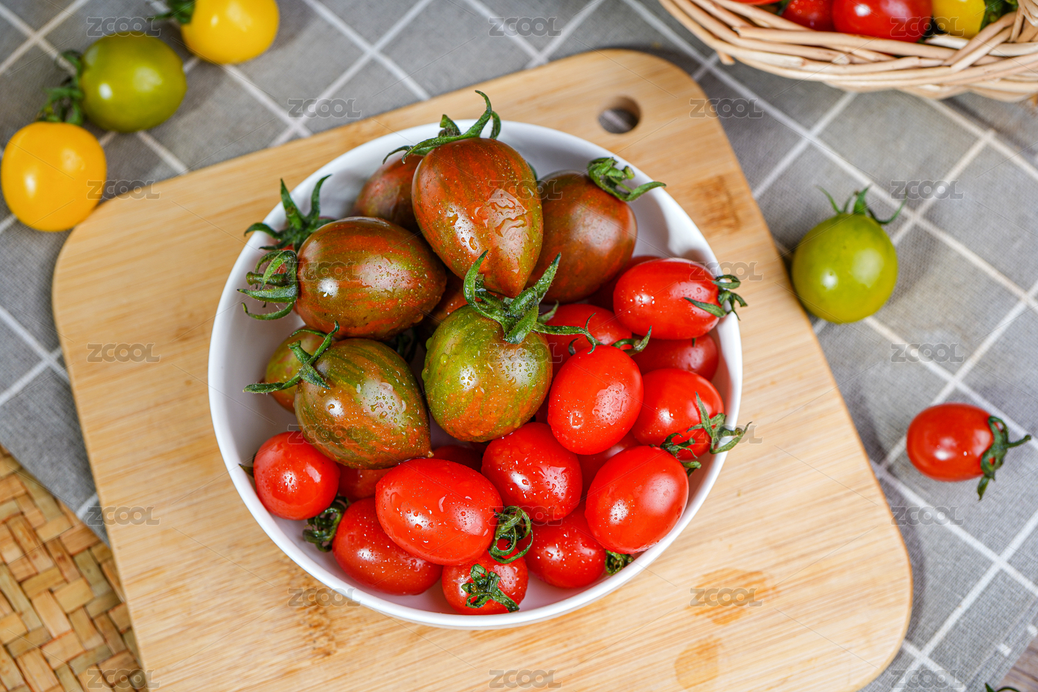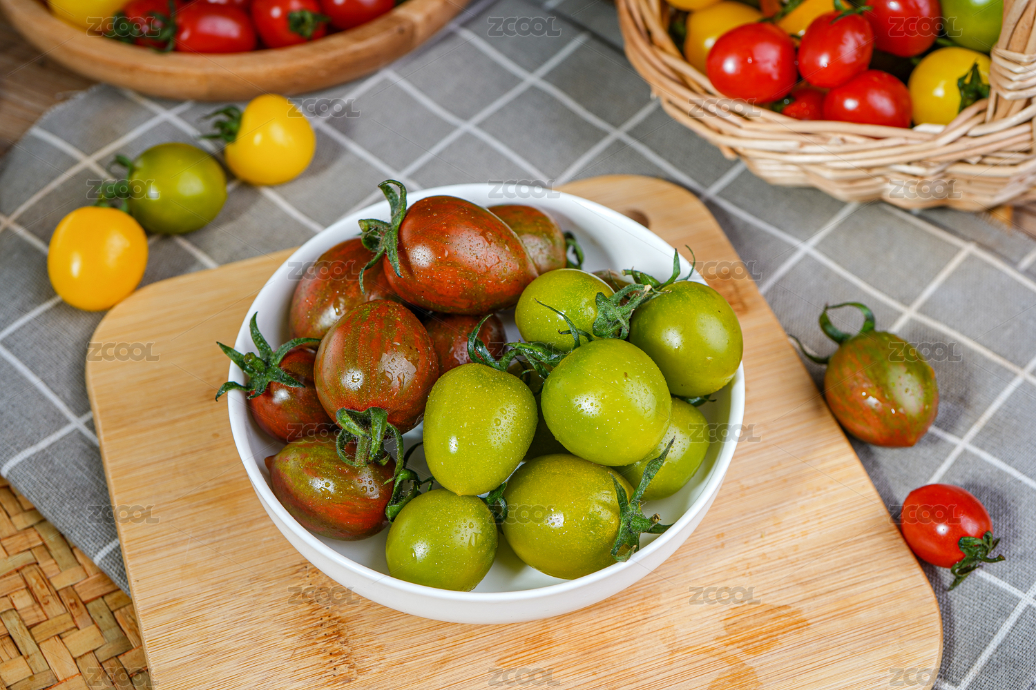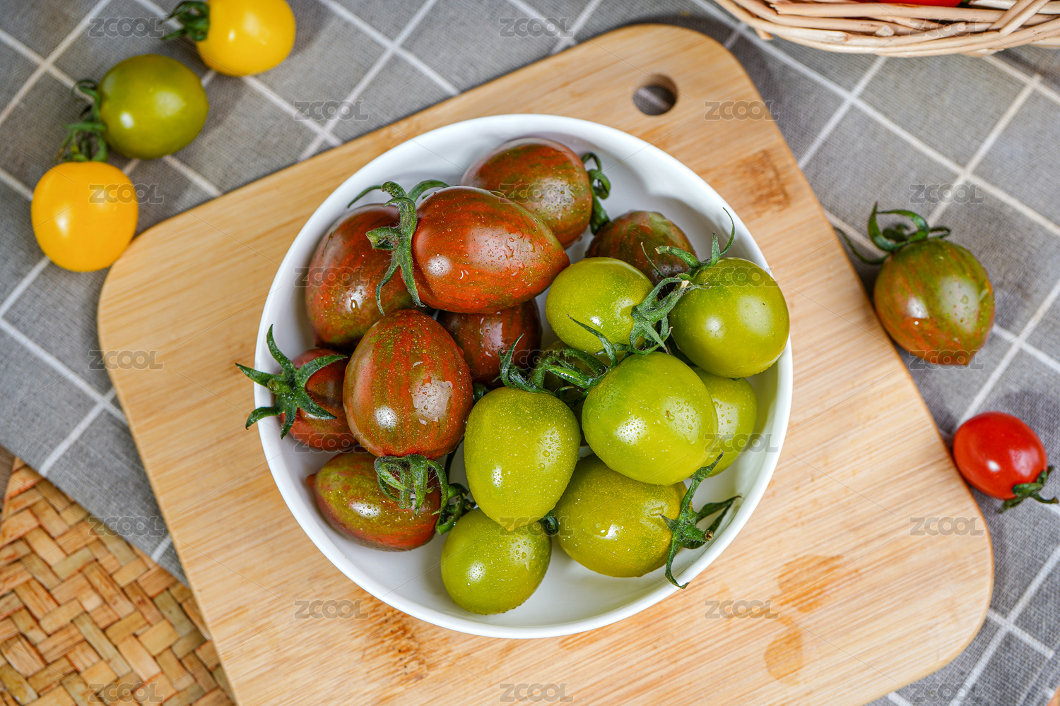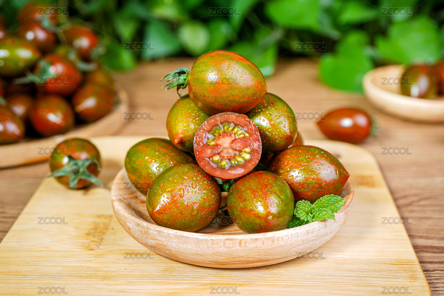 木板上放着一盘迷彩圣女果