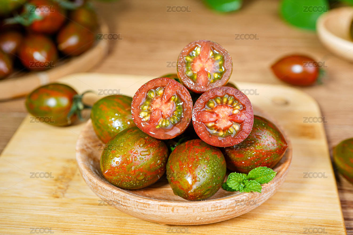 木桌上放着一盘迷彩小番茄