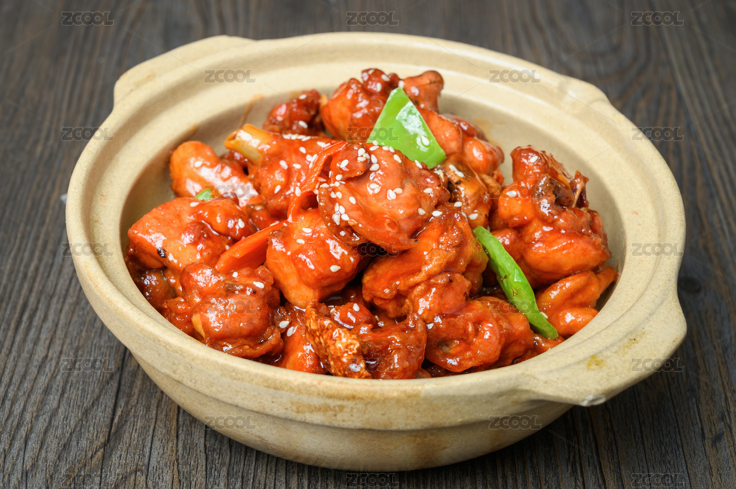 褐色砂锅装的香焖牛仔骨摆放在黑色鹅卵石上