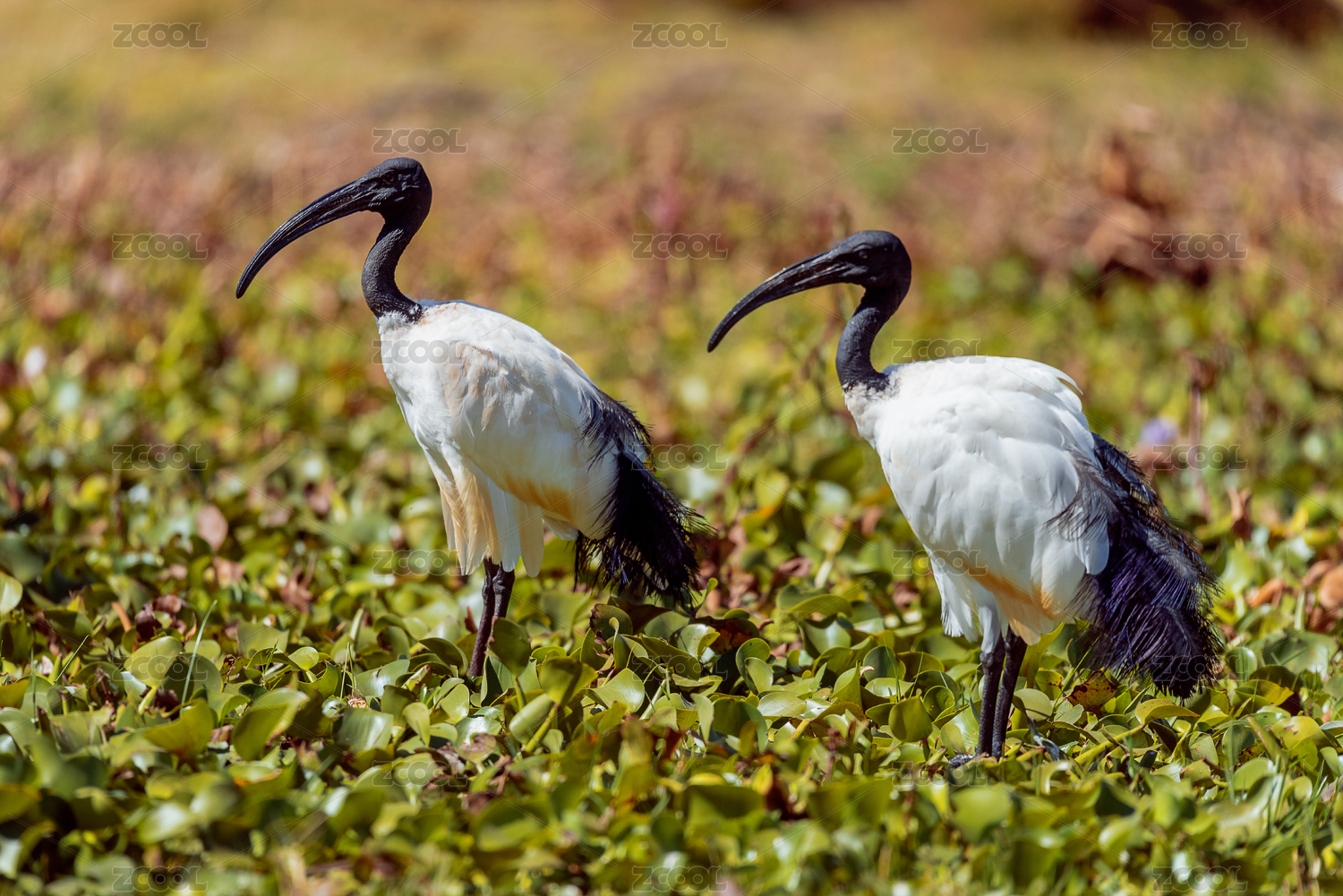 非洲肯尼亚纳瓦沙湖的湿地上两只圣鹮(Sacred Ibis)正在行进