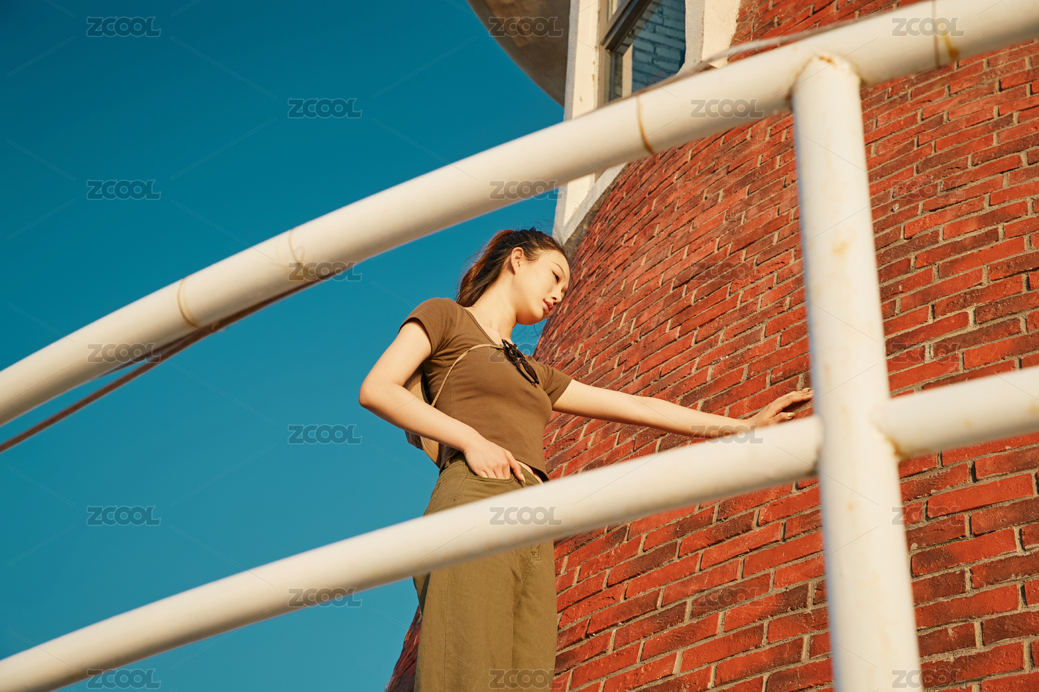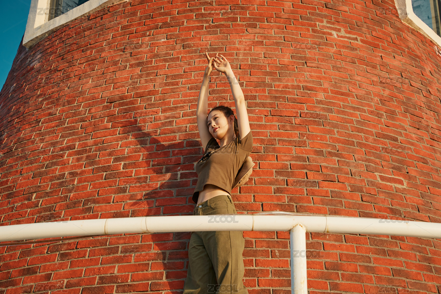 盛夏夕阳晚霞湖边码头灯塔上的少女
