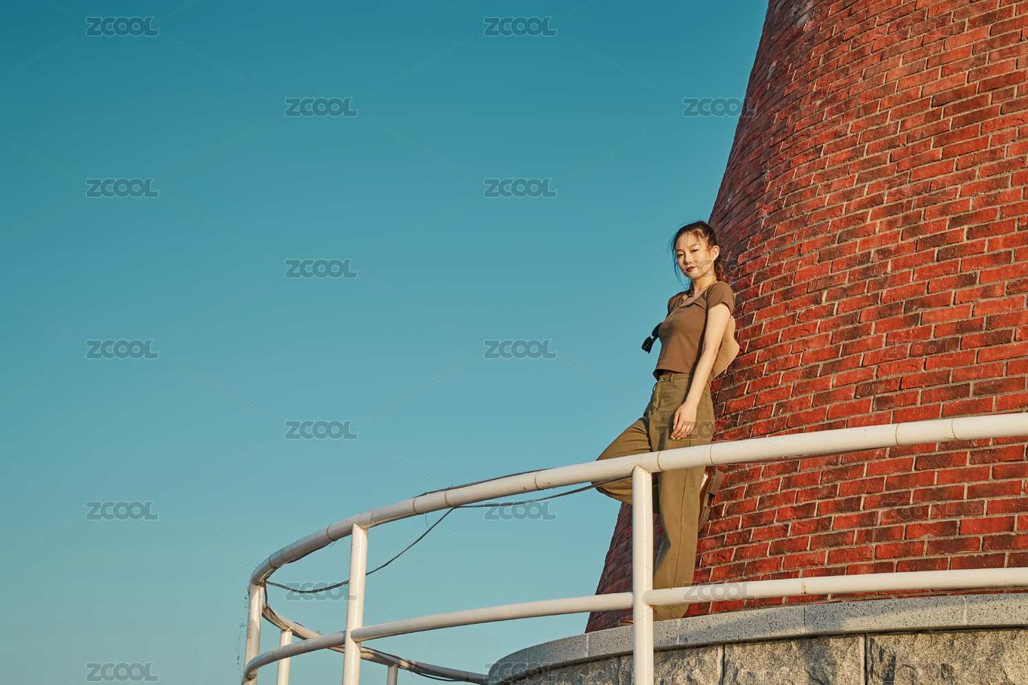 盛夏在景区湖边灯塔上拍照游玩的美女