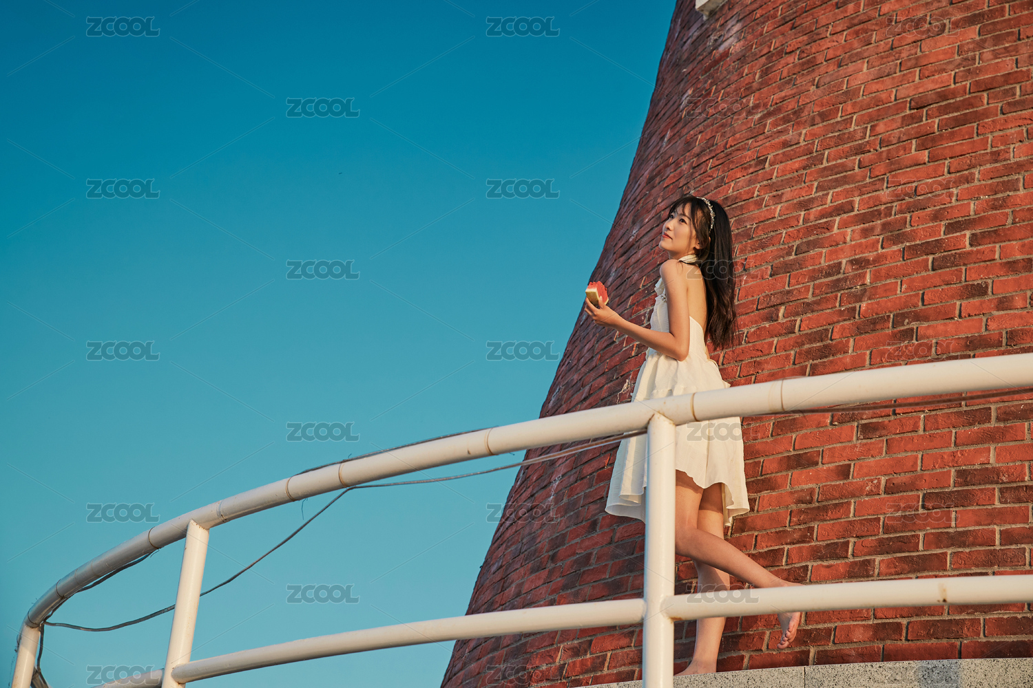 盛夏夕阳湖边码头灯塔上吃西瓜的少女
