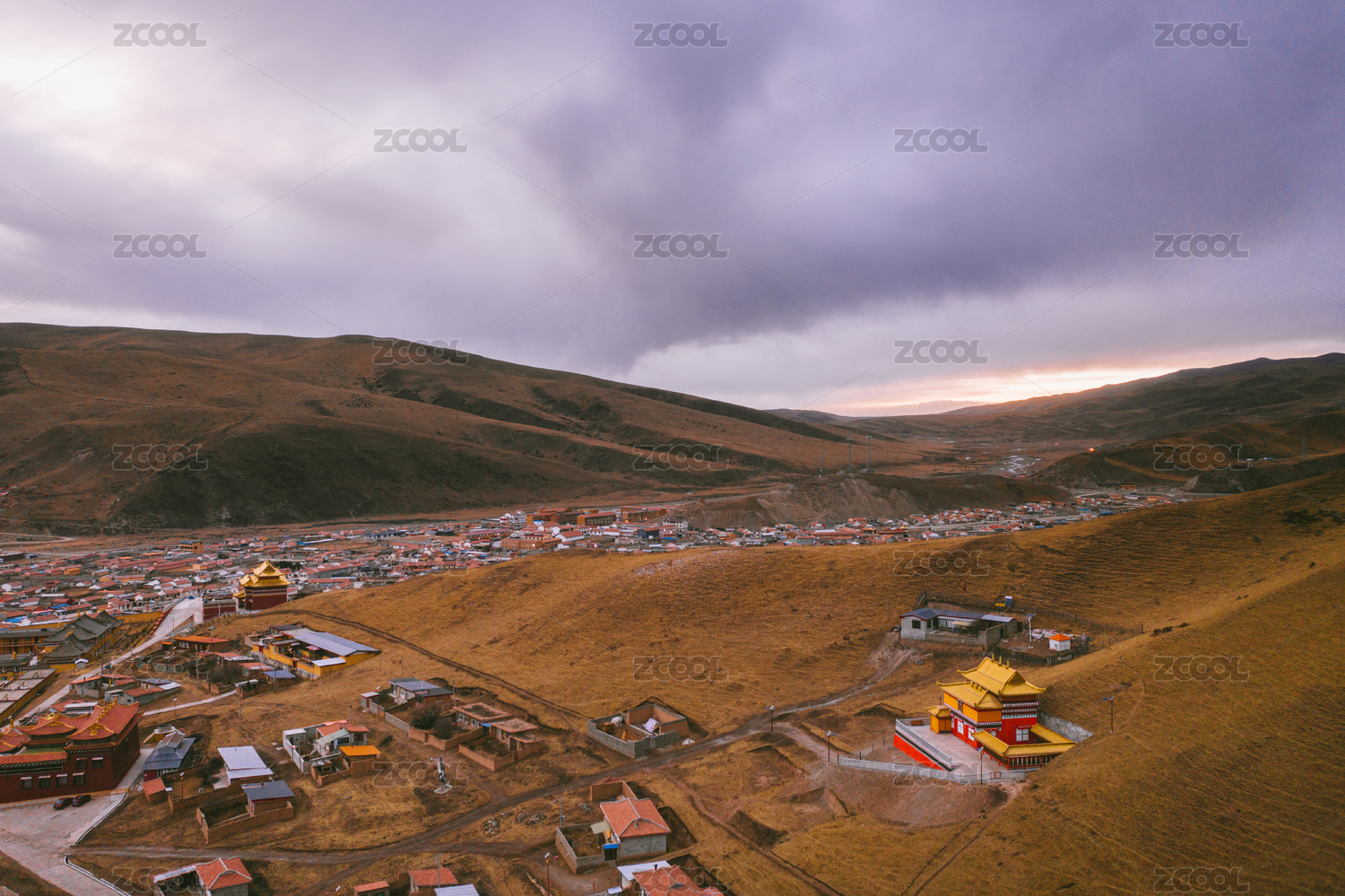 中国四川阿坝州阿坝县朗依寺日落航拍