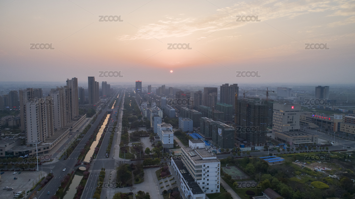 航拍霞光映照下的中国安徽宣城郎溪县城