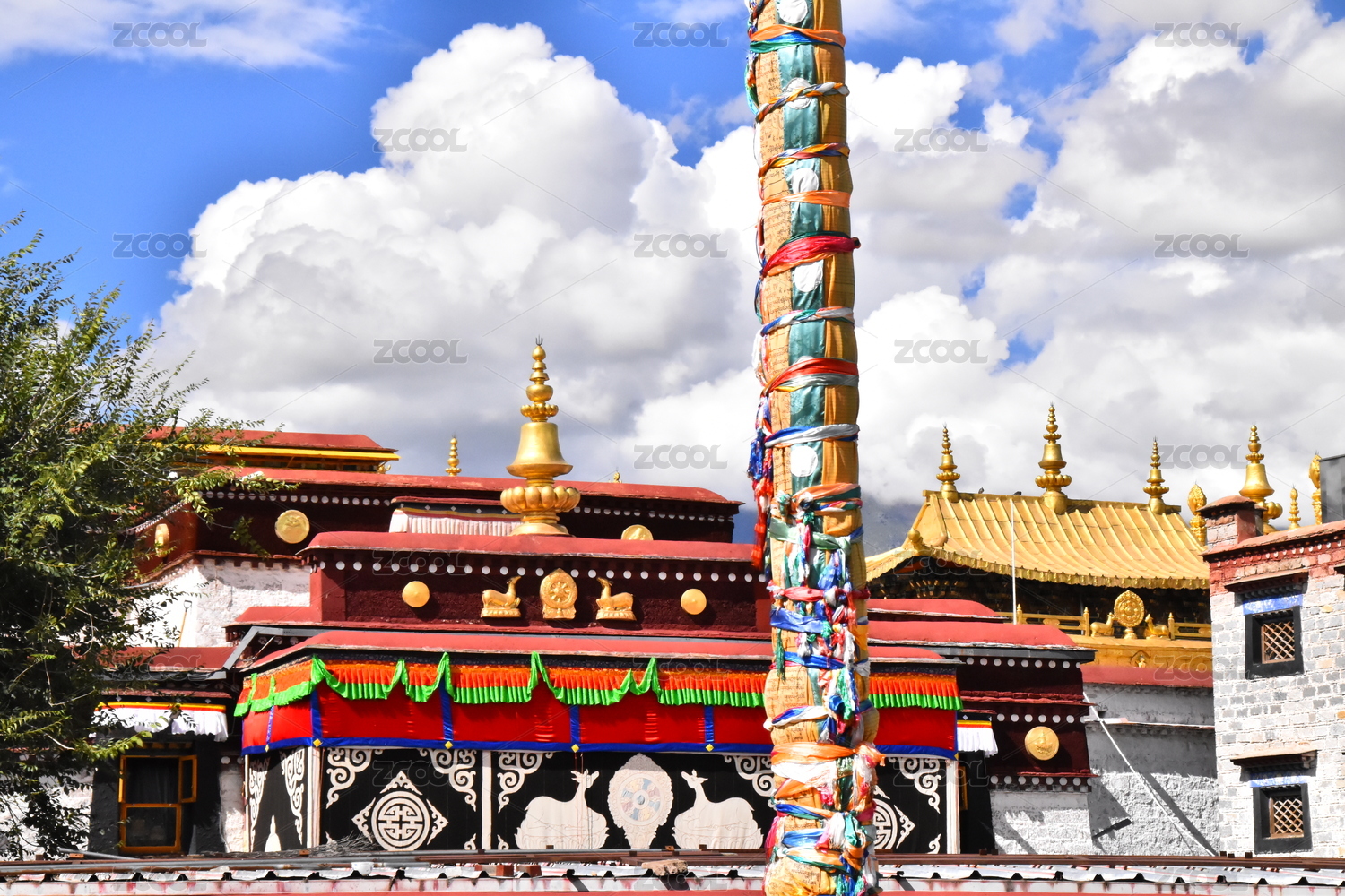 中国云南松赞林寺的屋檐与鎏金装饰