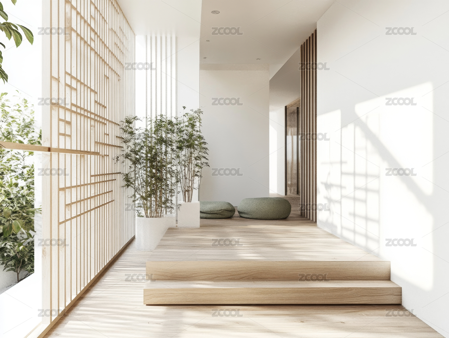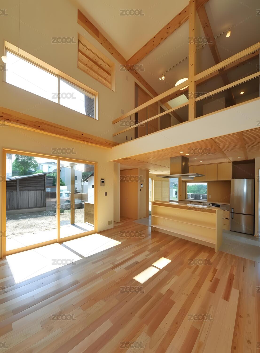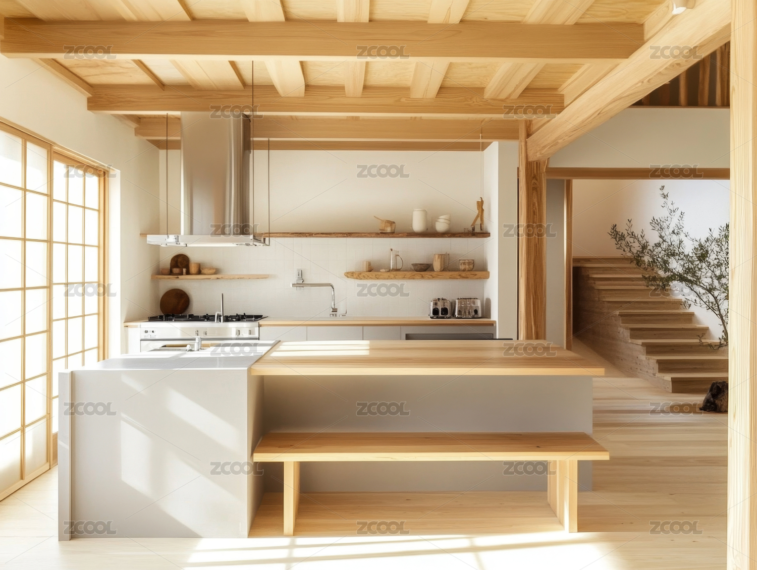 现代日式风格室内设计,木质楼梯和阳光