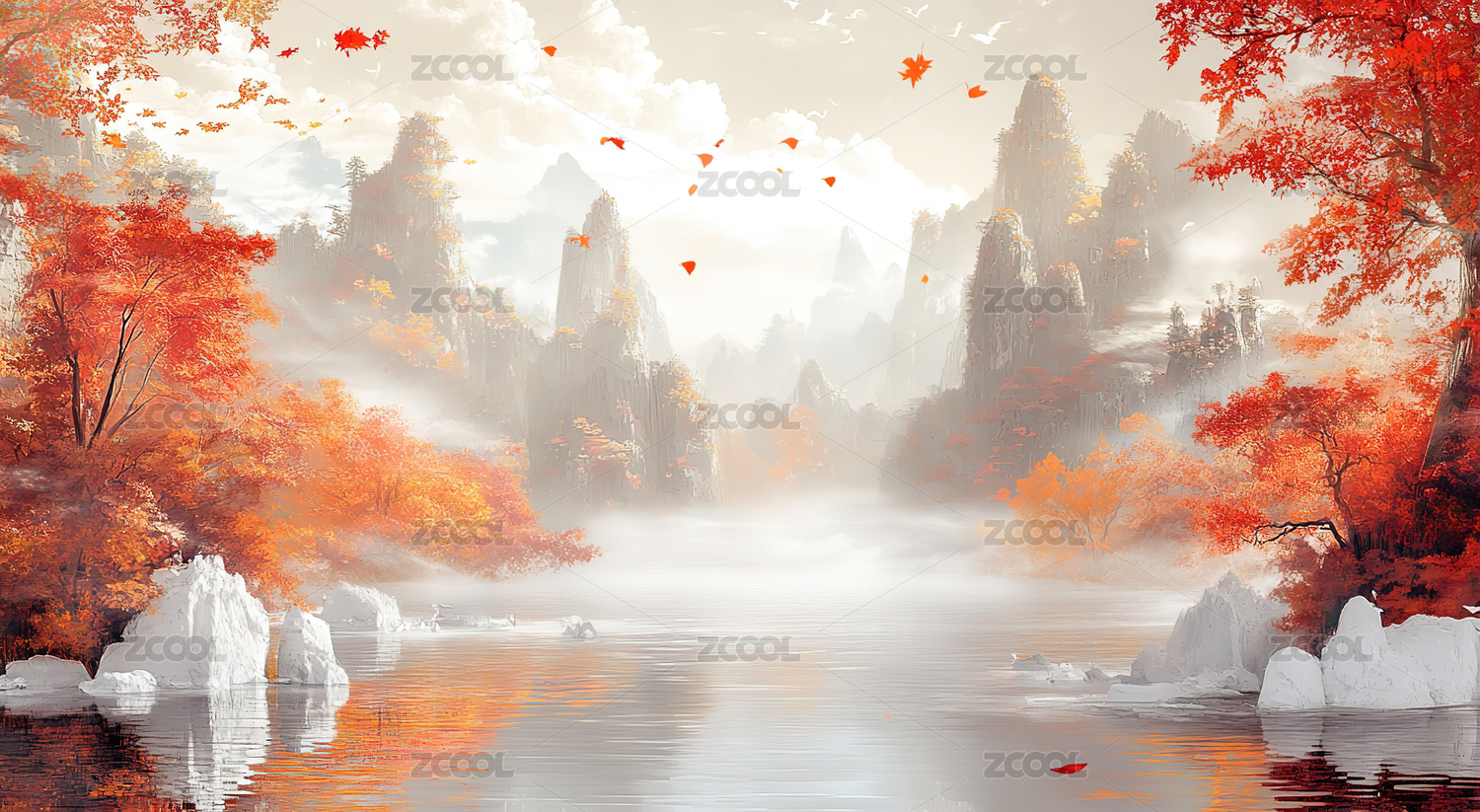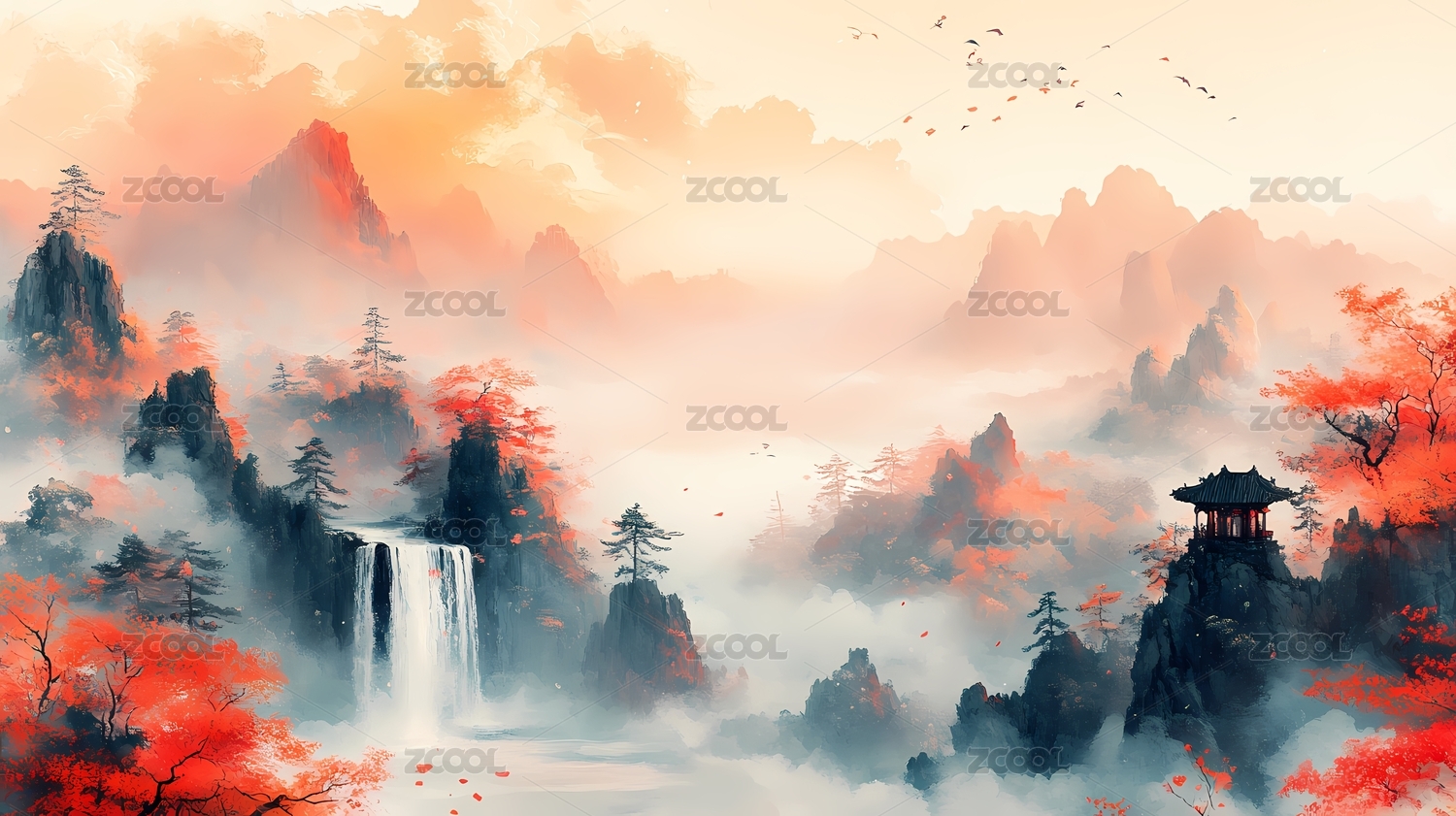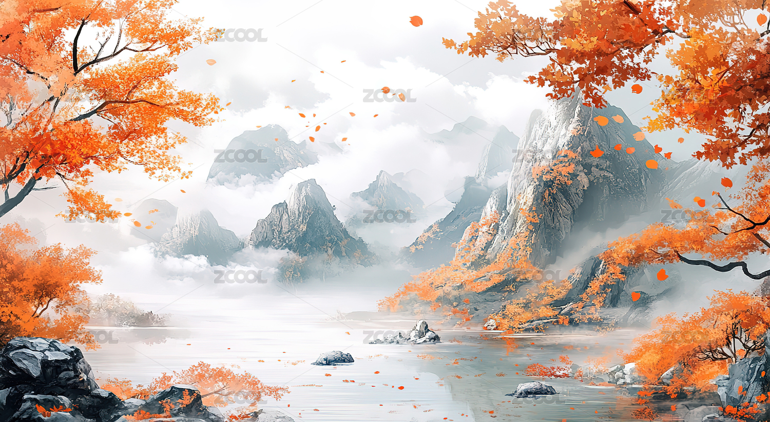 秋天,国风,山,水,自然,风景,插画,背景,瀑布,红叶