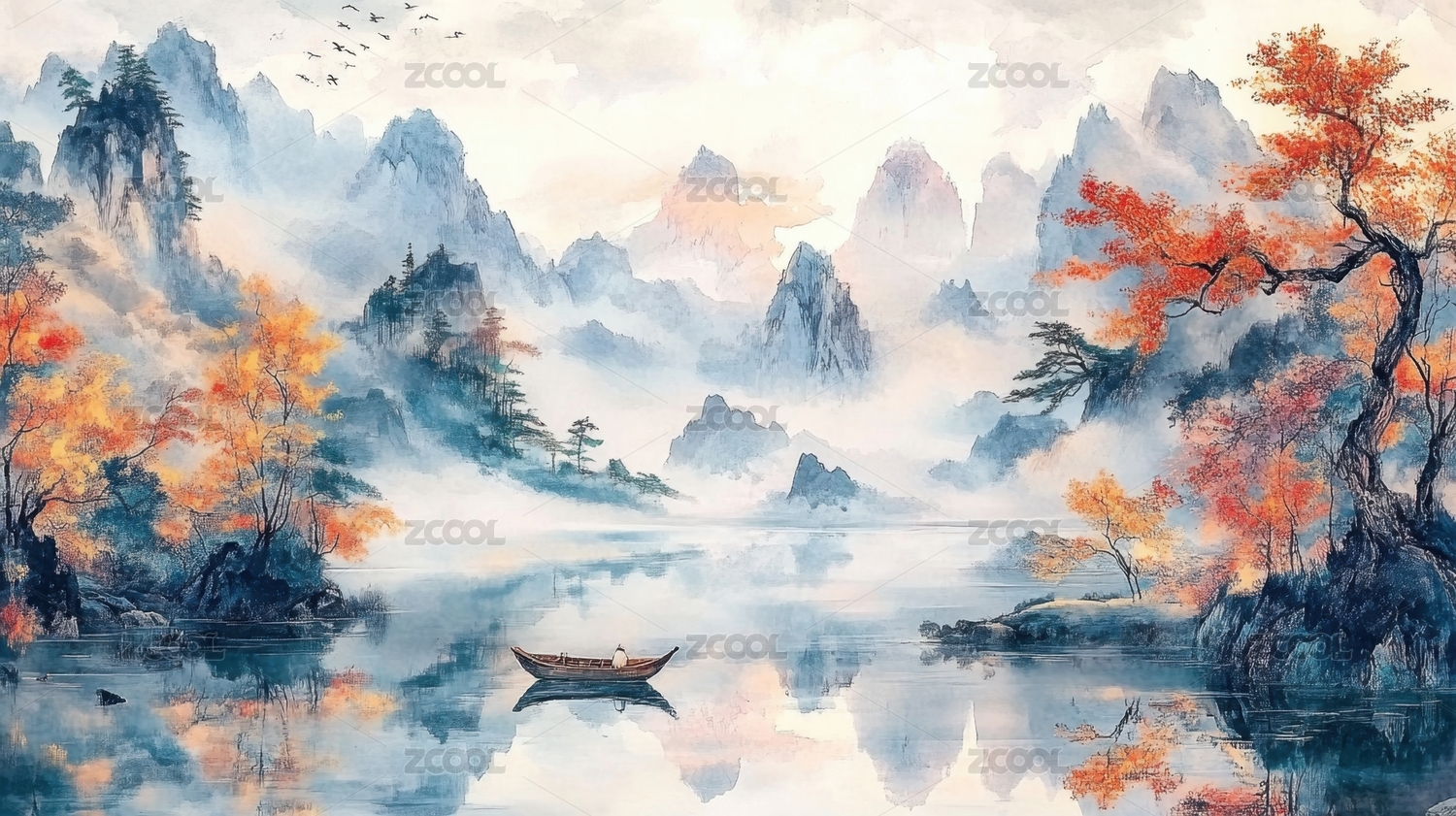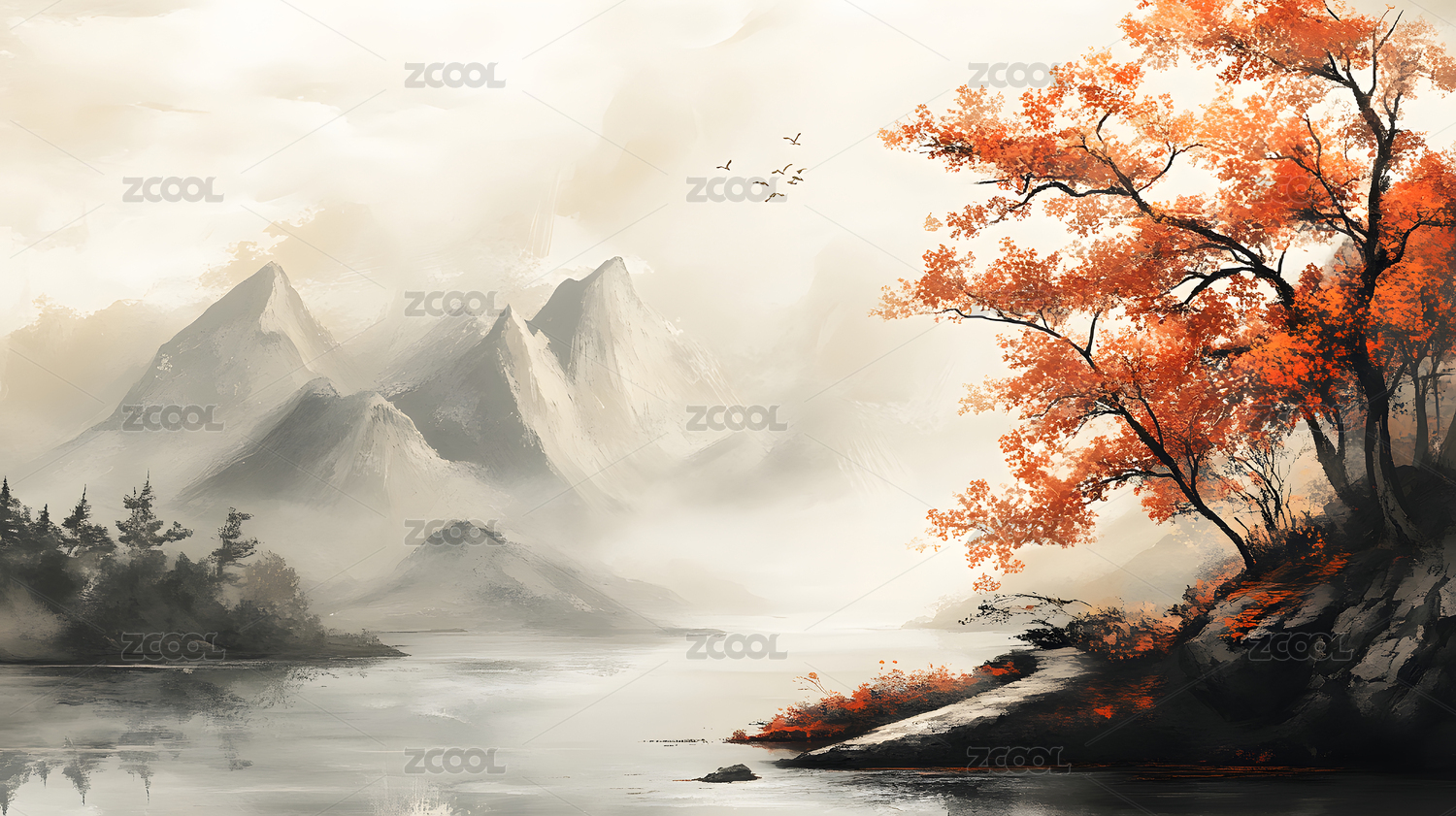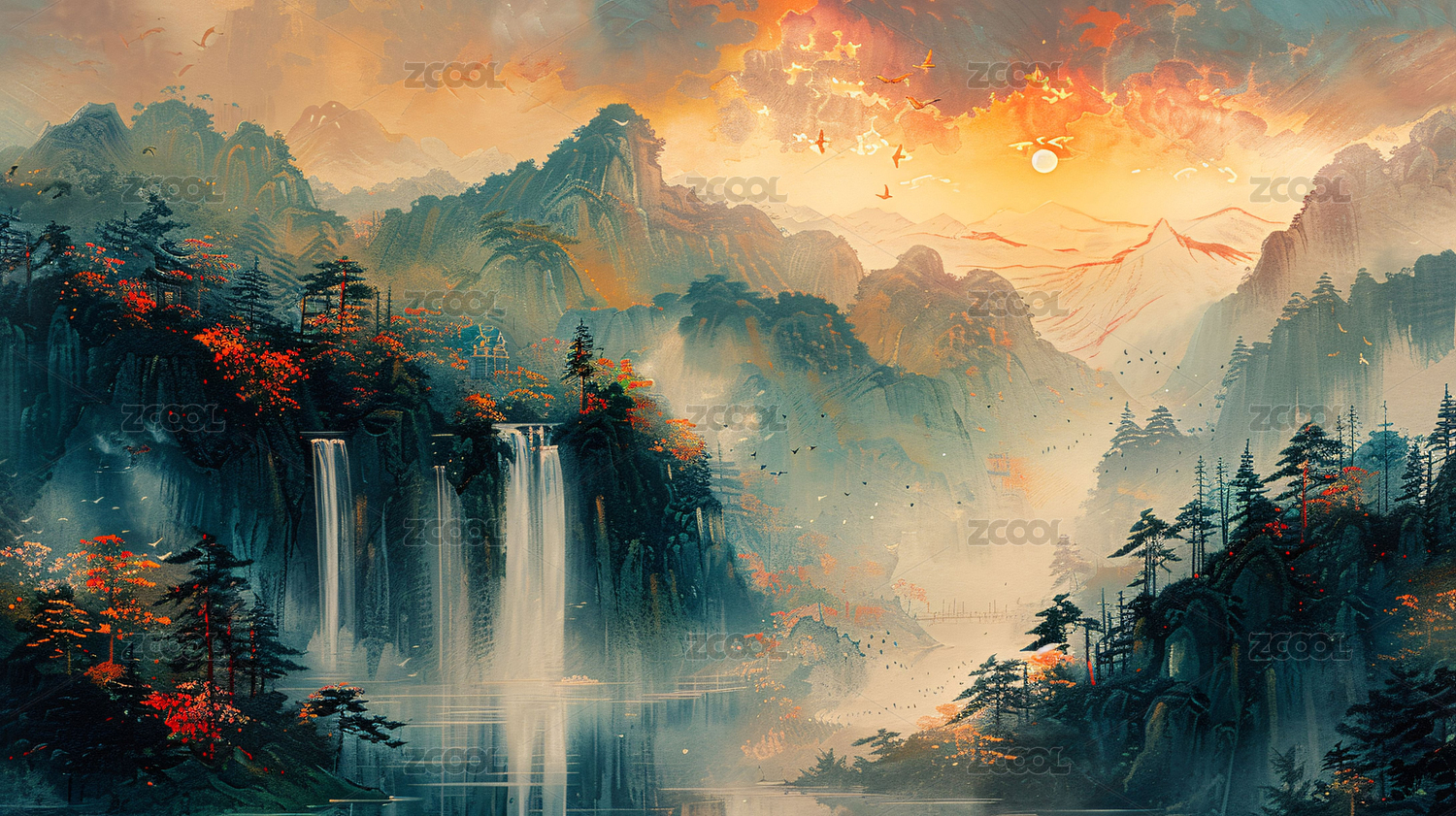 秋天,国风,山,水,自然,风景,插画,背景,瀑布,红叶