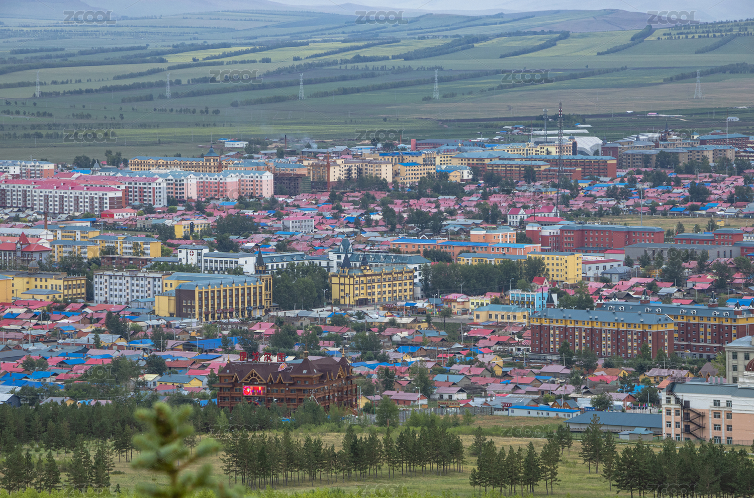 草原,城市,建筑,楼房,市区,远眺,鳞次节比,密密麻麻,远山,田野