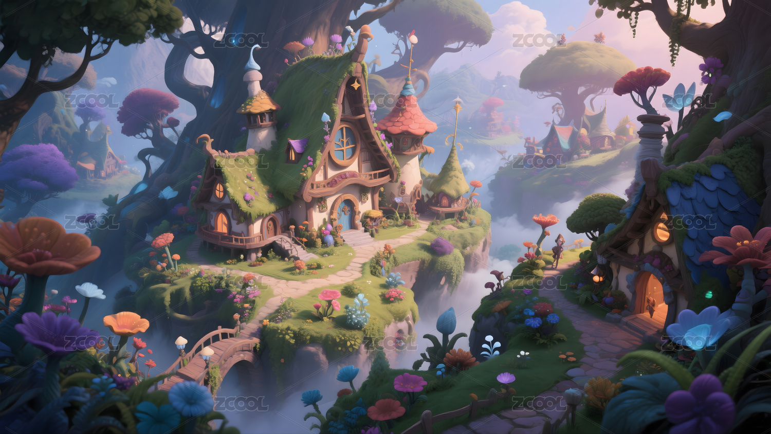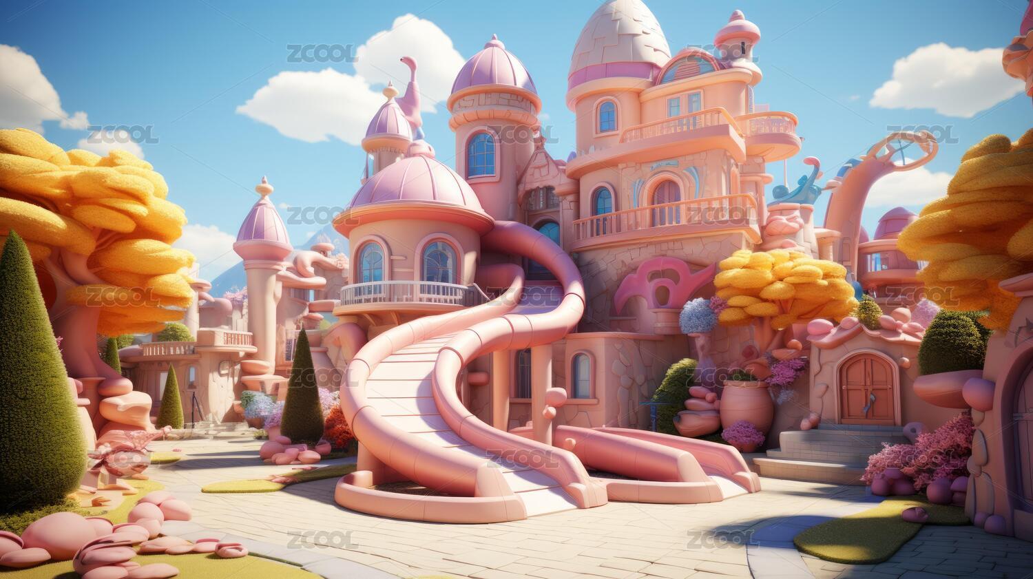 一座粉红色的糖果城堡的奇幻数字绘画带滑梯