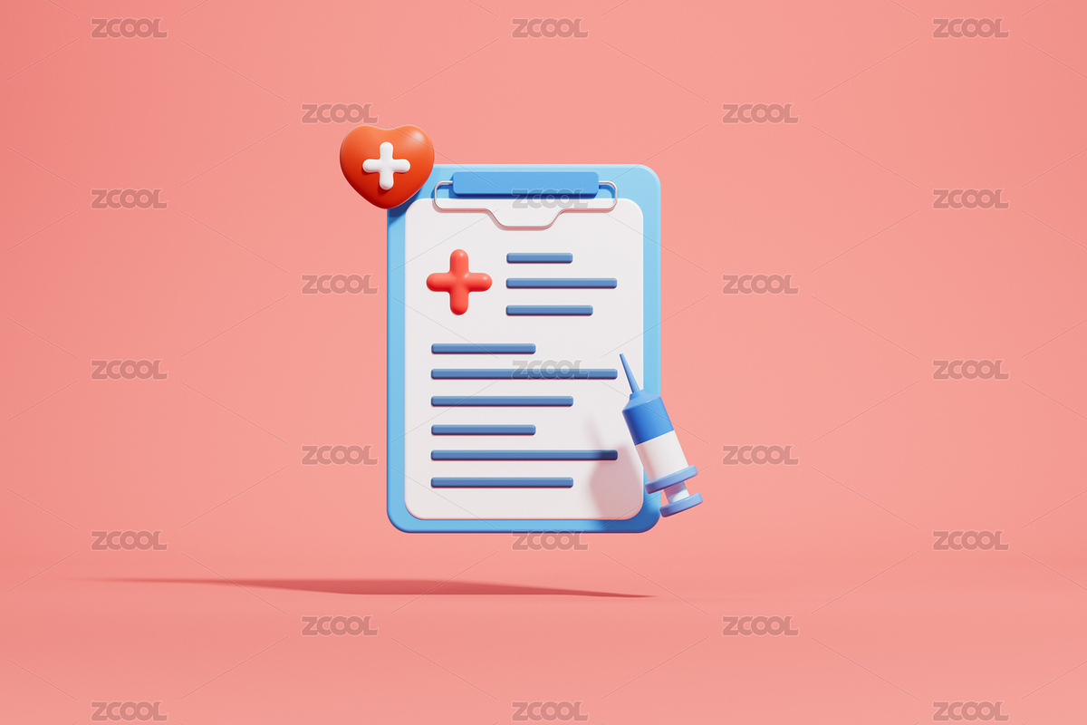 红色爱心的蓝色报告夹与药品药箱医疗素材