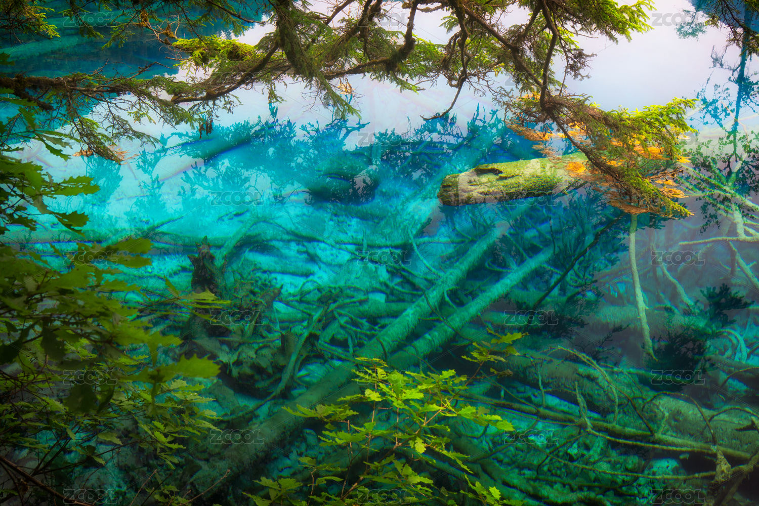 九寨沟,倒影,五花湖,树枝,枯叶,幽蓝