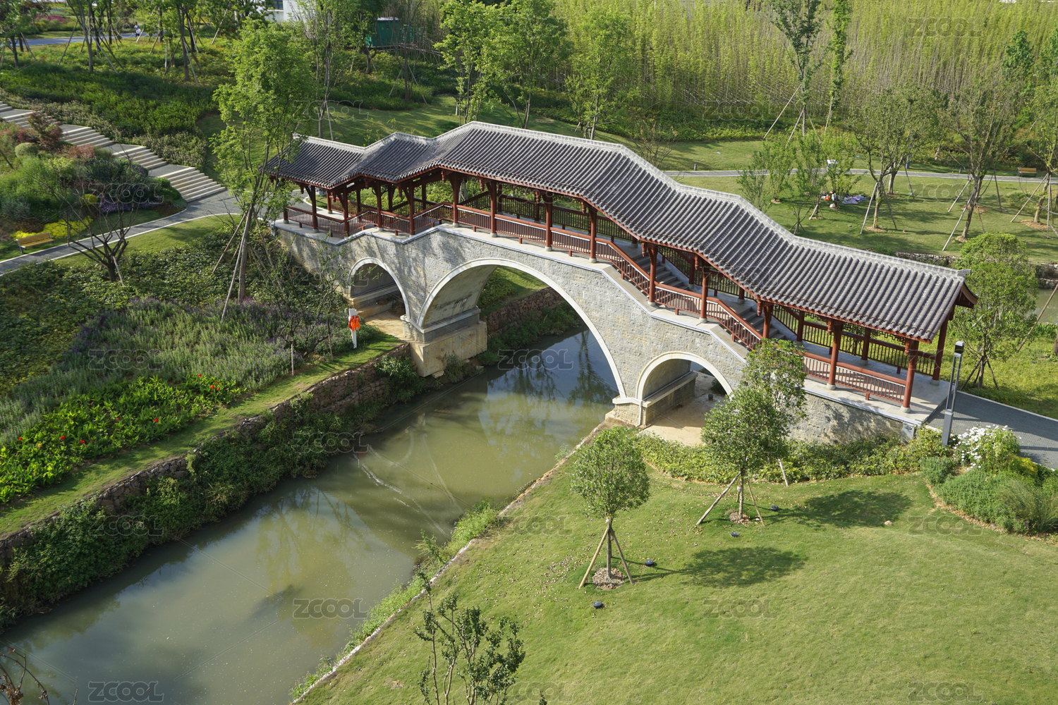 四川成都东安湖公园西江河廊桥分栋桥俯拍