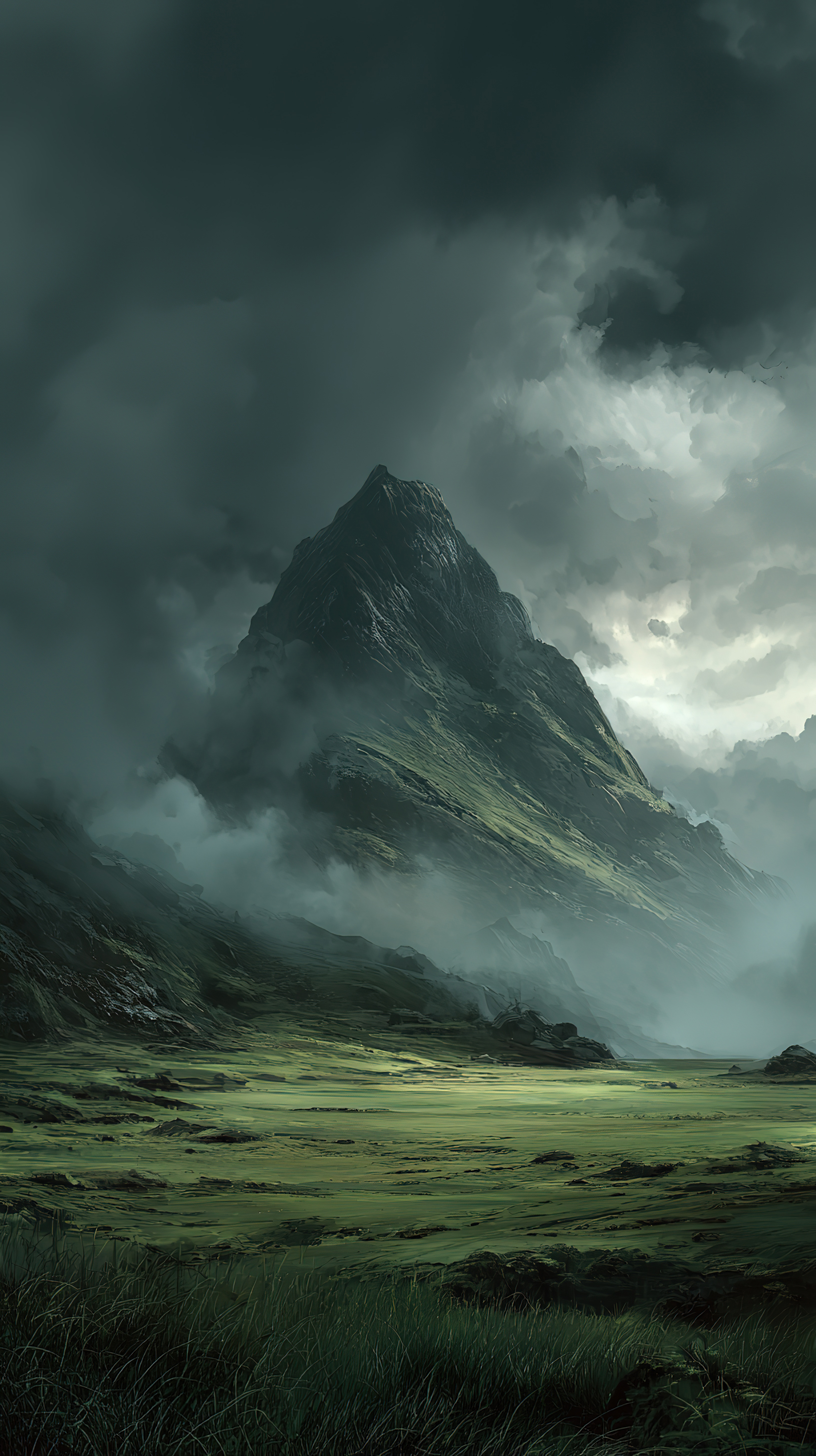 阴云笼罩的山峰与绿野