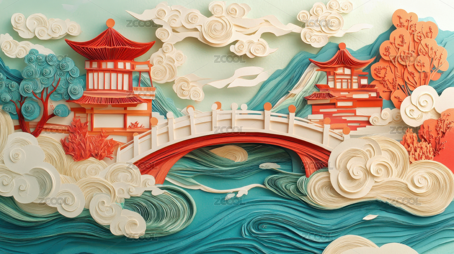 剪纸风中国古建筑红色背景新年春节喜庆庆祝