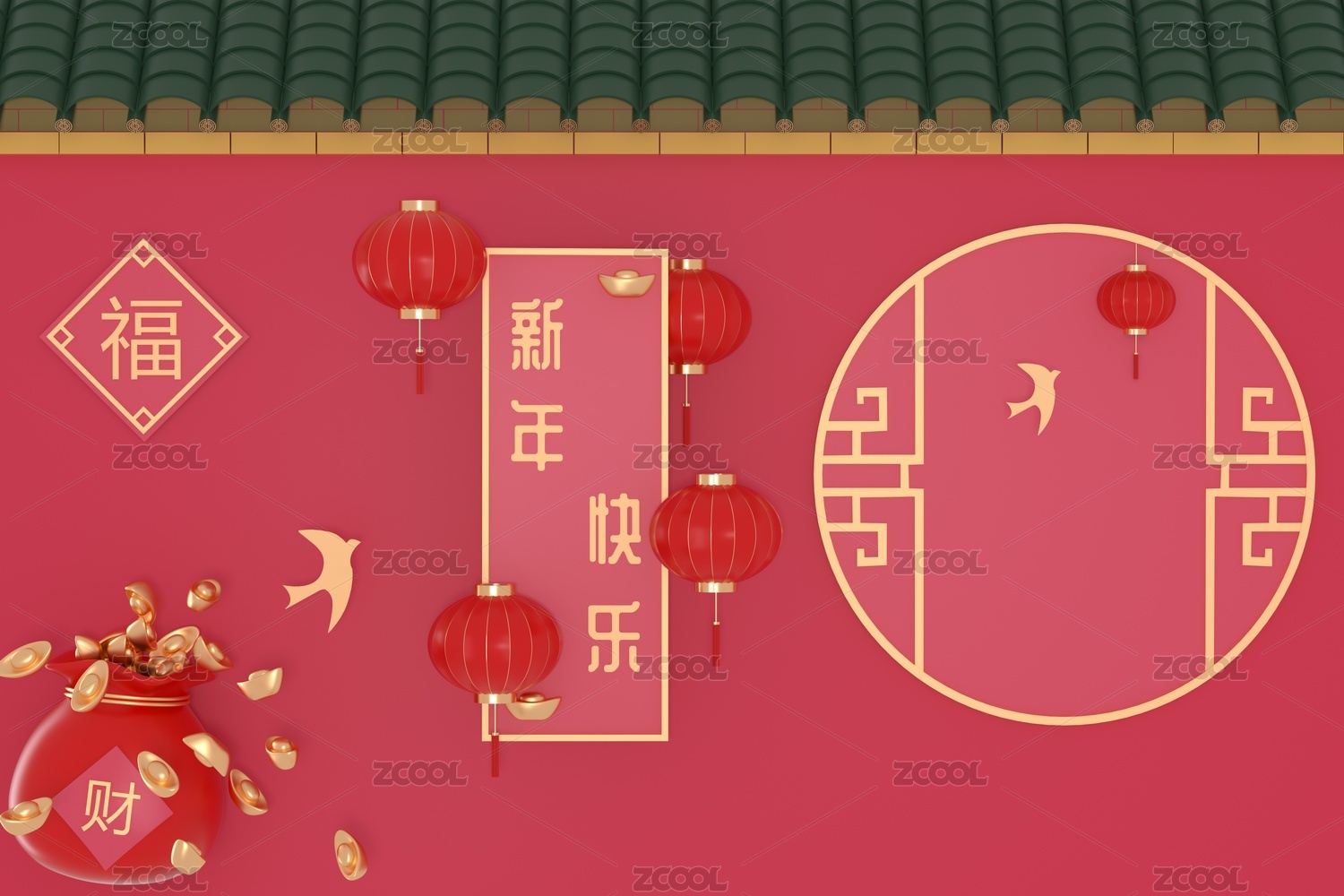 带有中国传统花窗和灯笼图案的春节喜庆海报