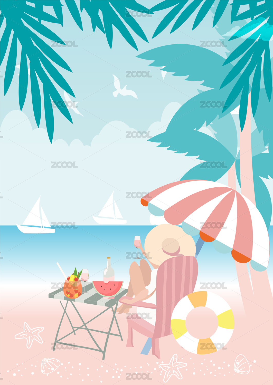 竖版夏季海边沙滩度假女孩矢量插画