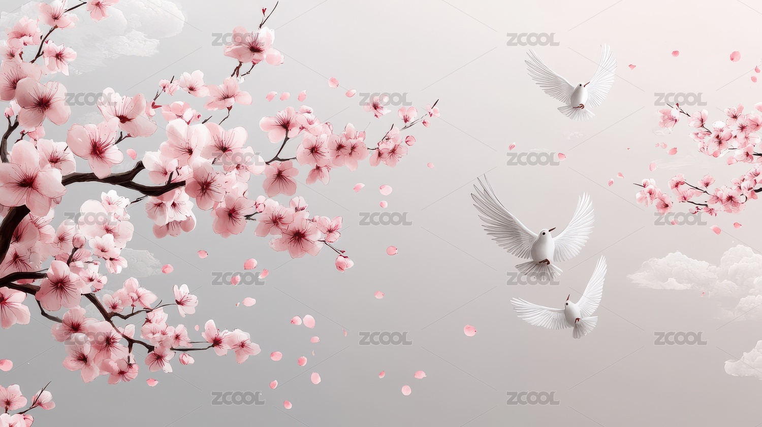 中国风水彩鸟麻雀植物树枝鲜花插画