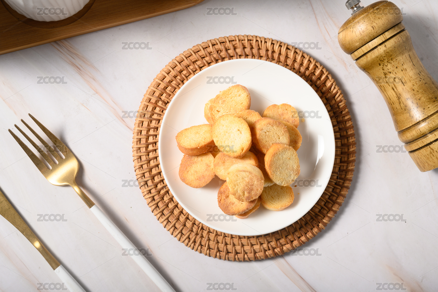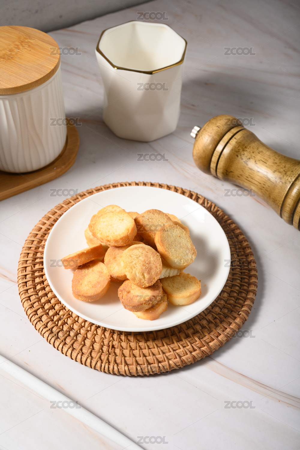 桌面上的盘子里的美味可口的香靠馍片