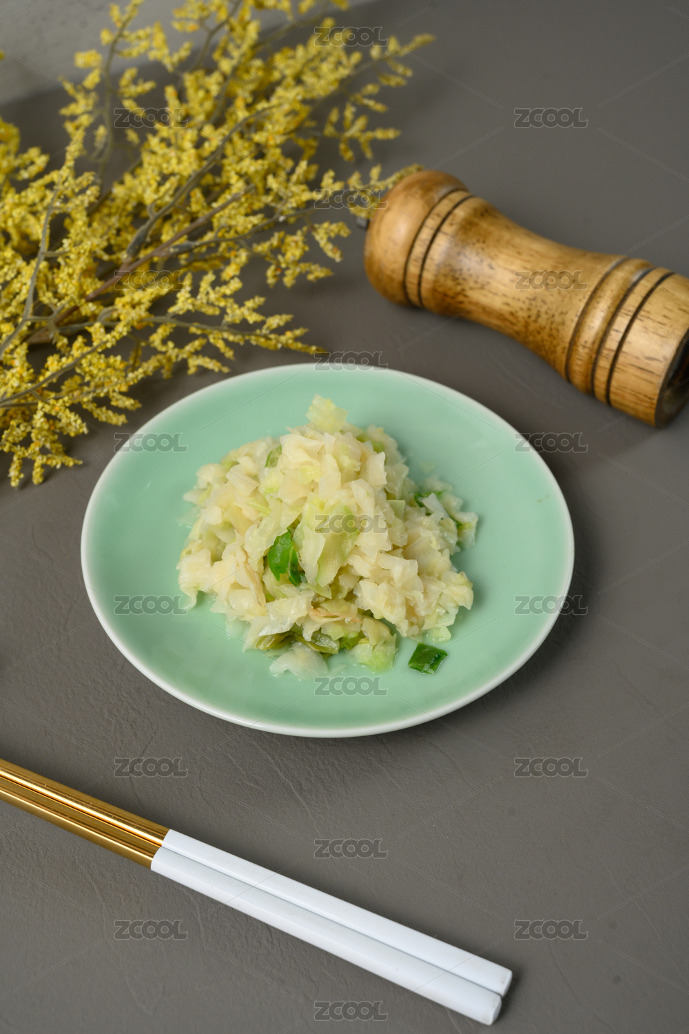 桌面上的盘子里的美味可口的泡发开的高丽菜