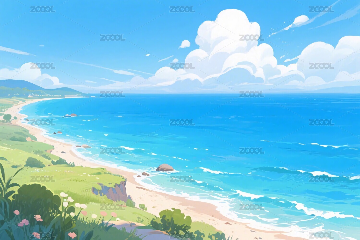 手绘卡通唯美的海边风景插画