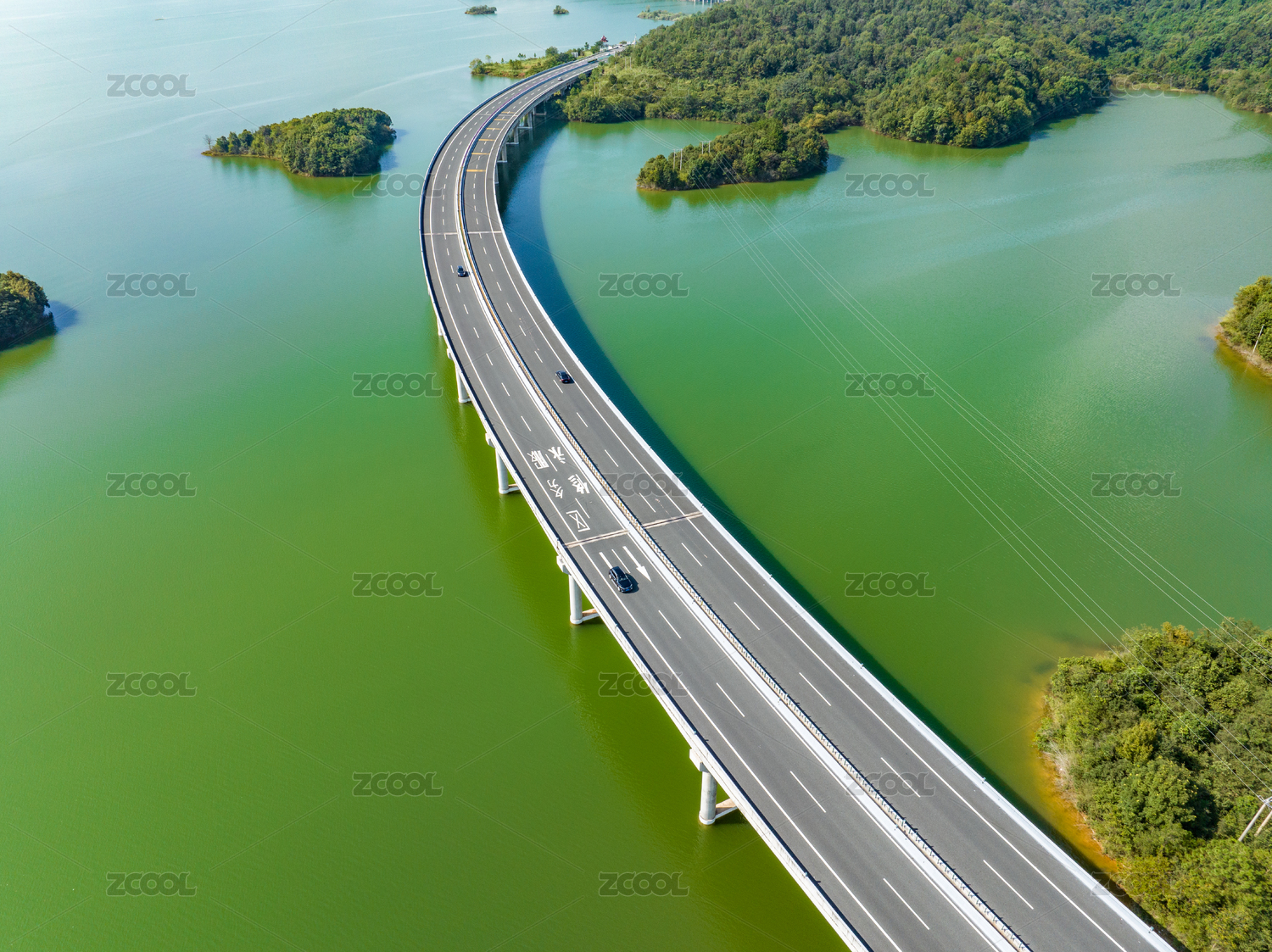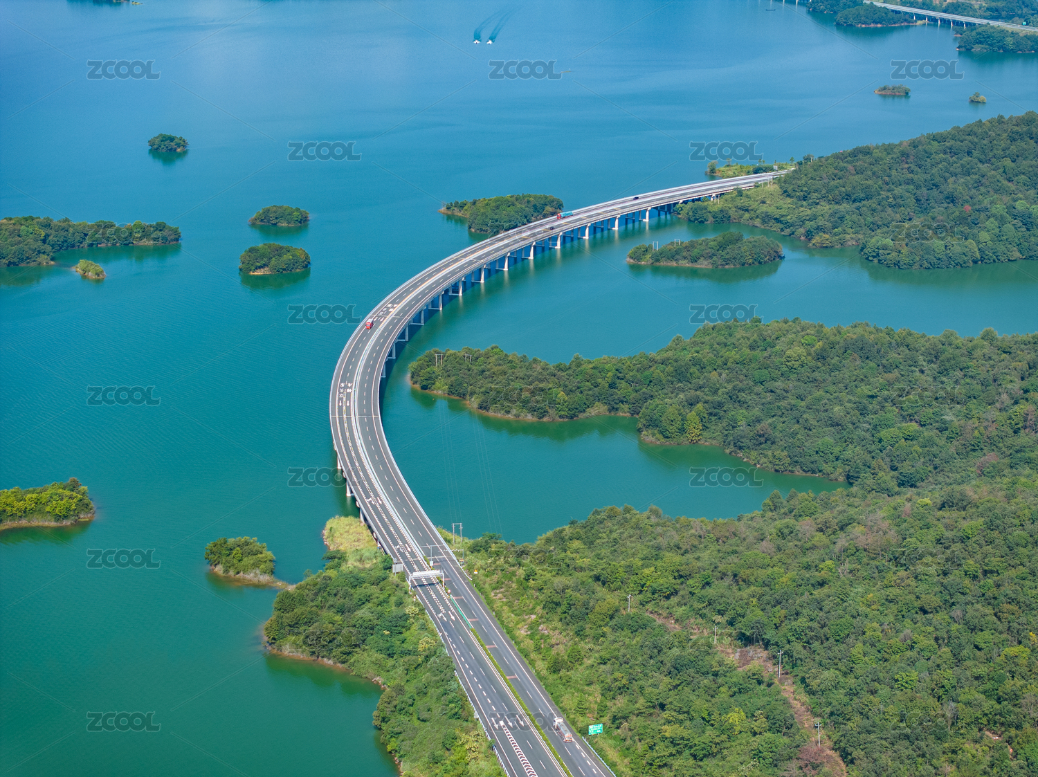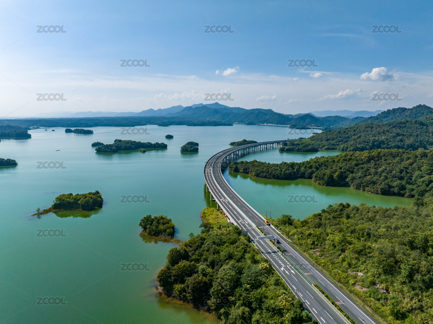 江西靖安观海驿站大型水库中的桥梁和公路俯