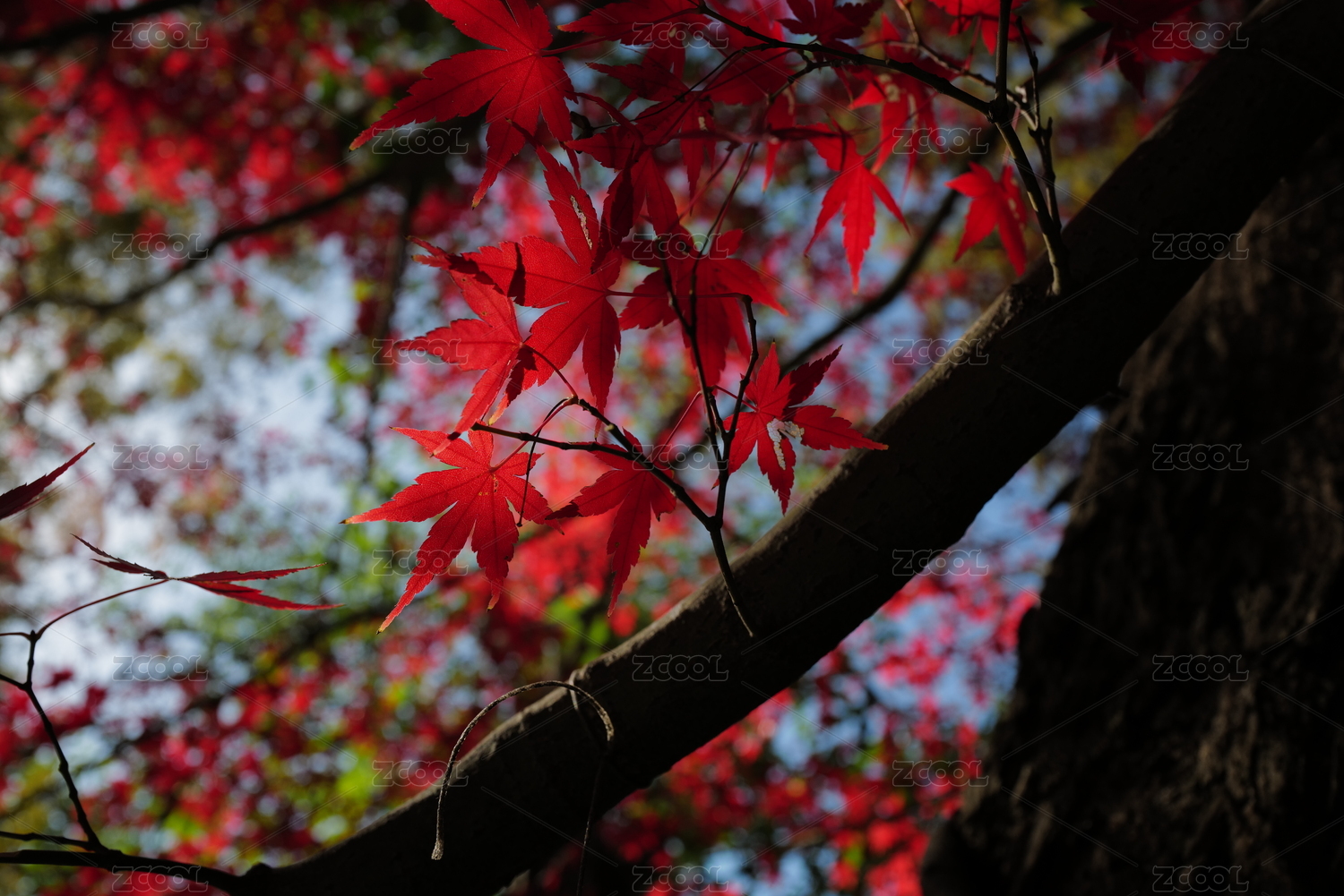 深秋逆光照耀下晶莹剔透的红色枫叶