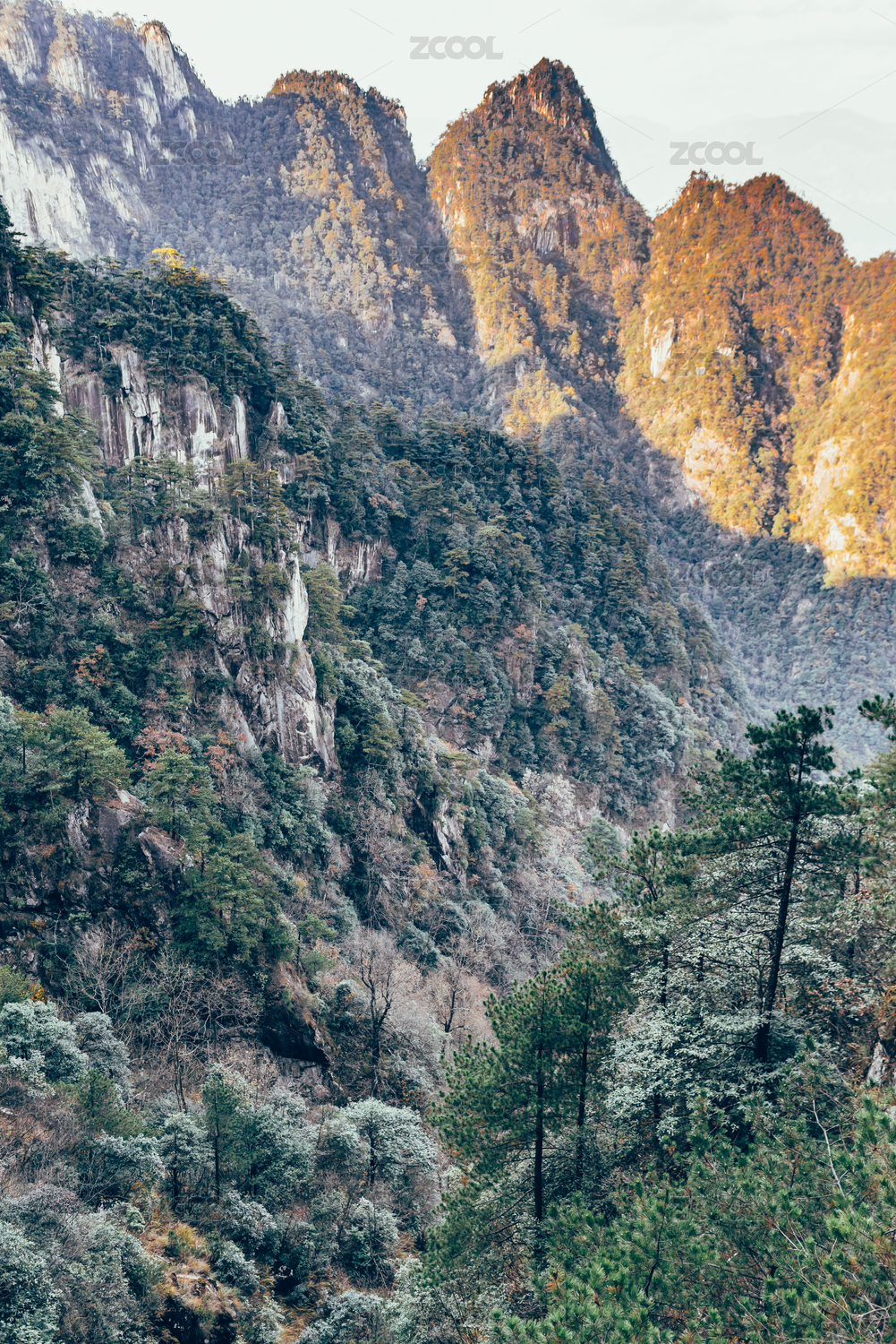 中国四川阿坝州奶子沟彩林云雾缭绕悬崖峭壁