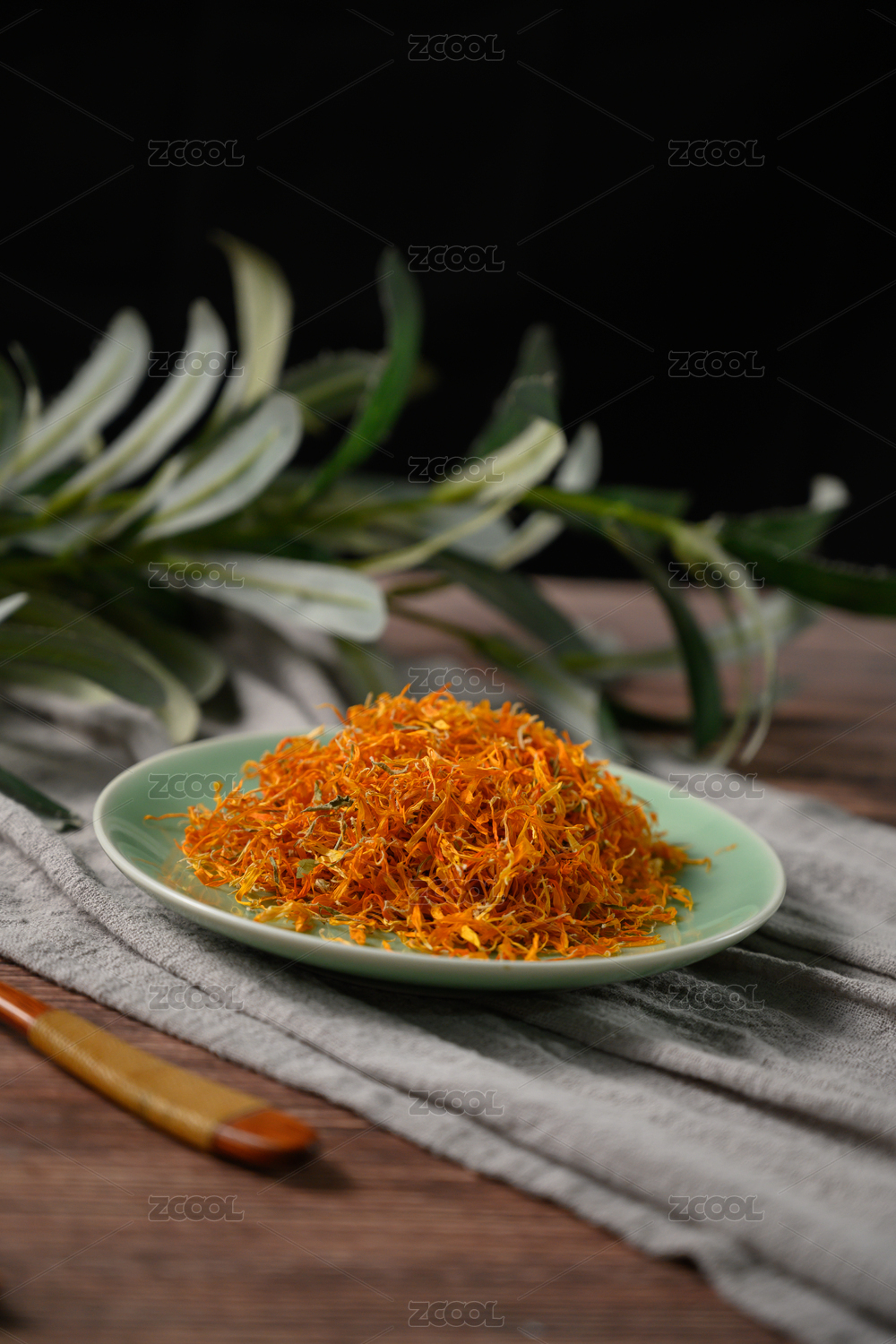 桌面上的盘子里的干爽的金盏菊花花瓣