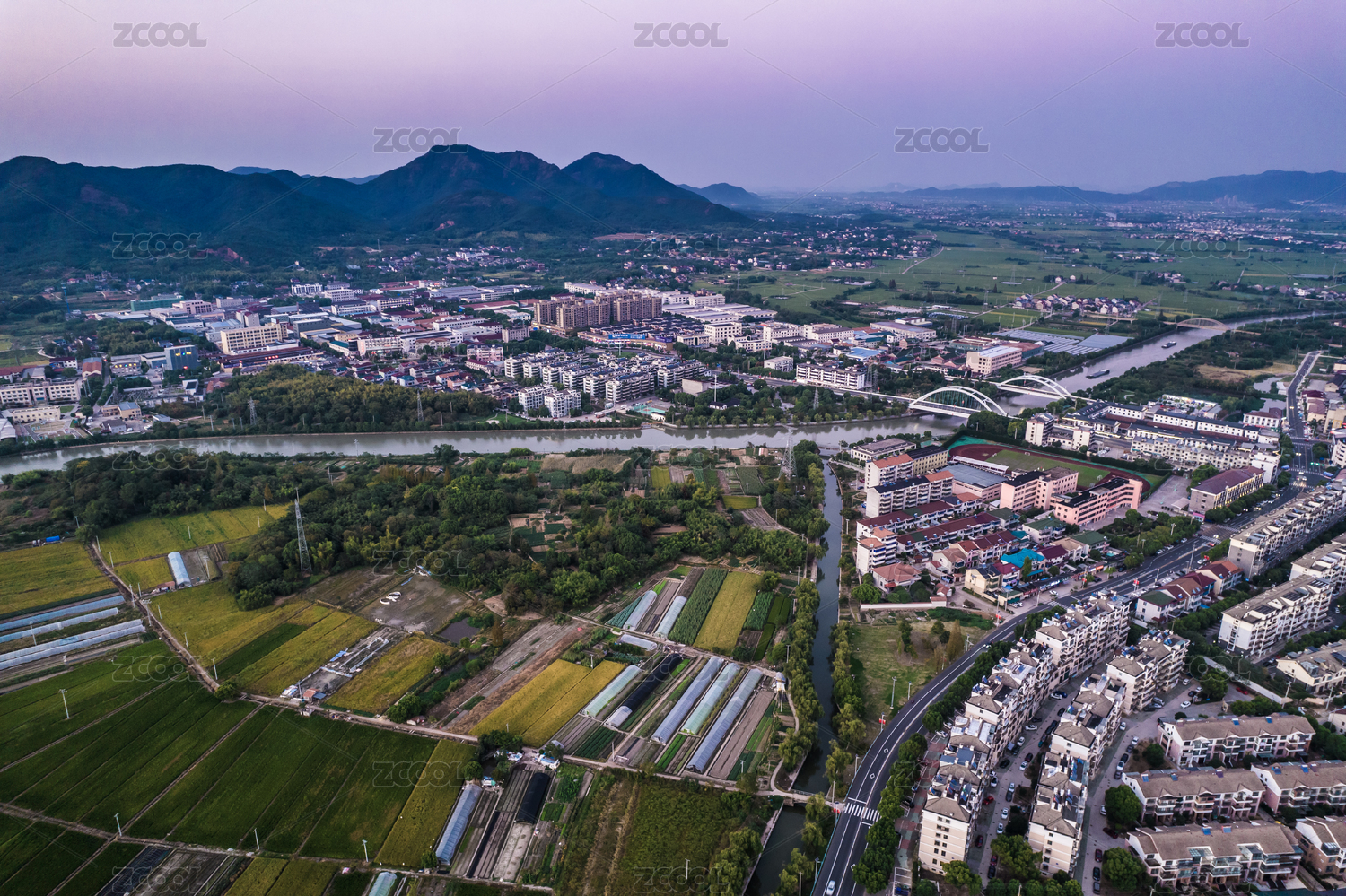 航拍,小镇,田园风光,河网,江南,水乡,地形,山峦,日暮光
