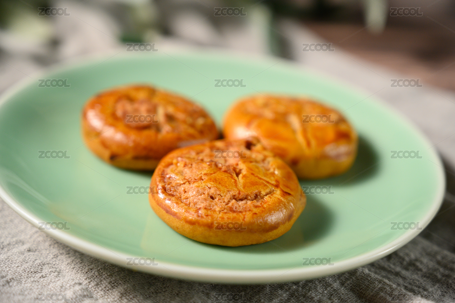 黄色背景上绿色盘子里的老婆饼