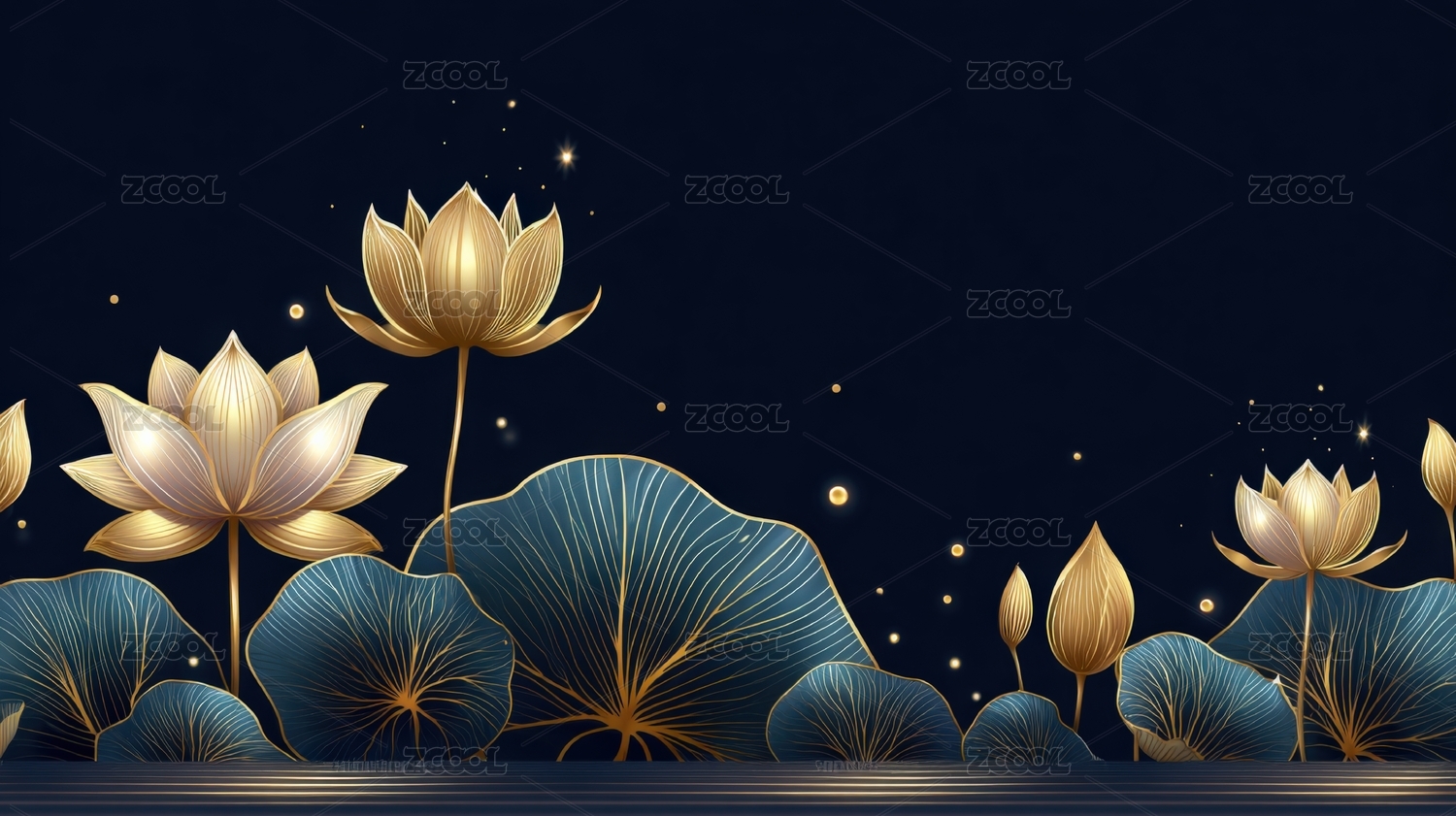 橙色国潮荷花灯荷叶金色线条水面唯美场
