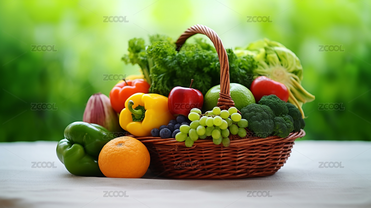 木桌子上菜篮子里的新鲜的水果蔬菜