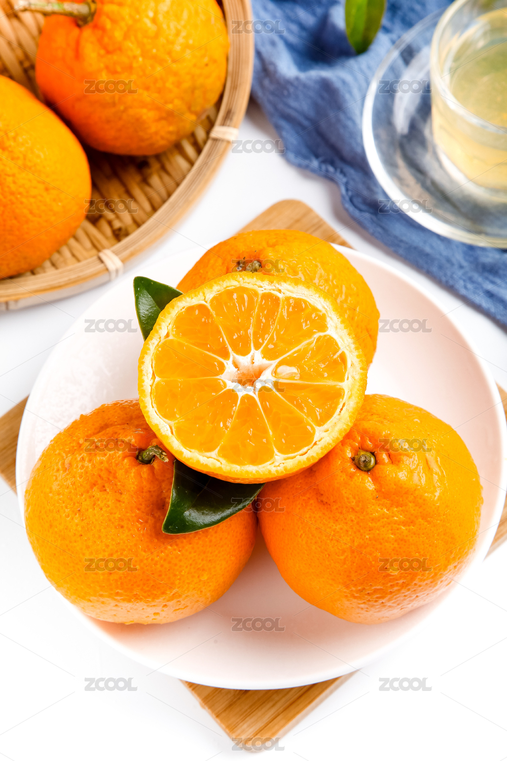 木底垫子上放着一盘赣南脐橙和脐橙果肉