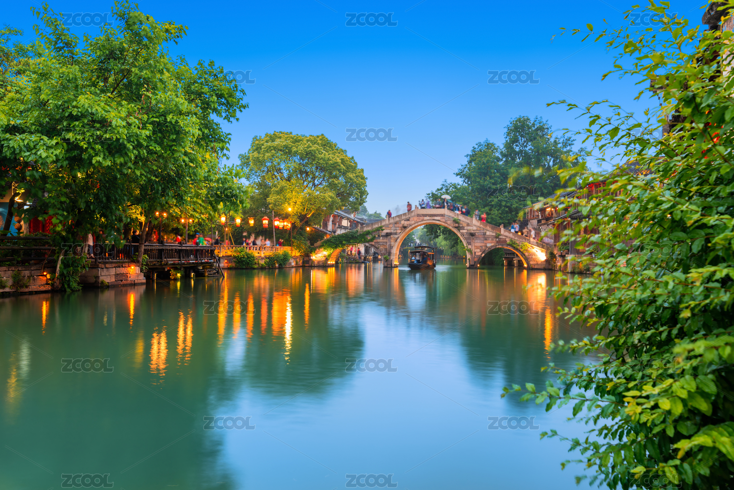中国嘉兴桐乡乌镇西栅景区西市河三孔桥夜景