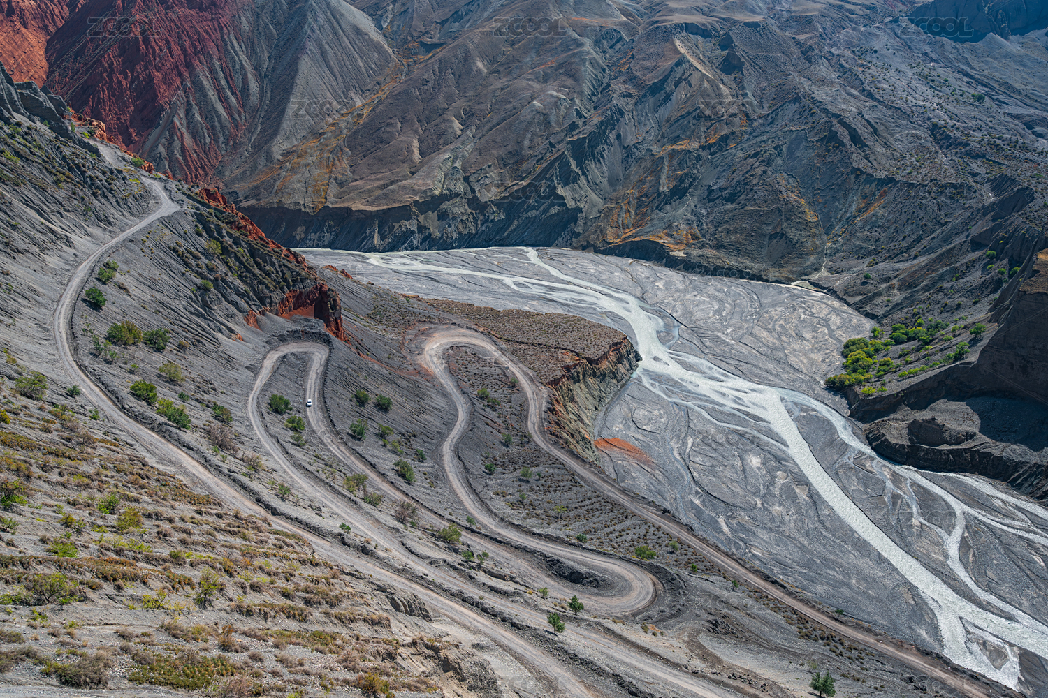 车辆行驶在中国新疆帕米尔高原塔莎古道